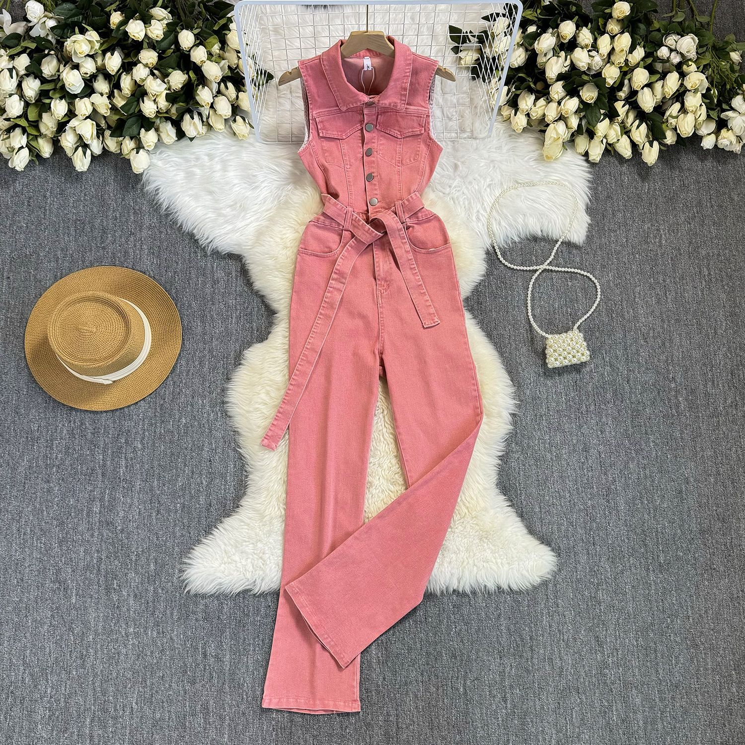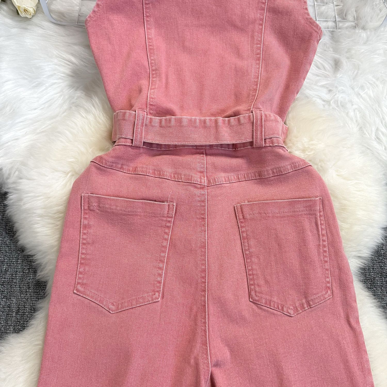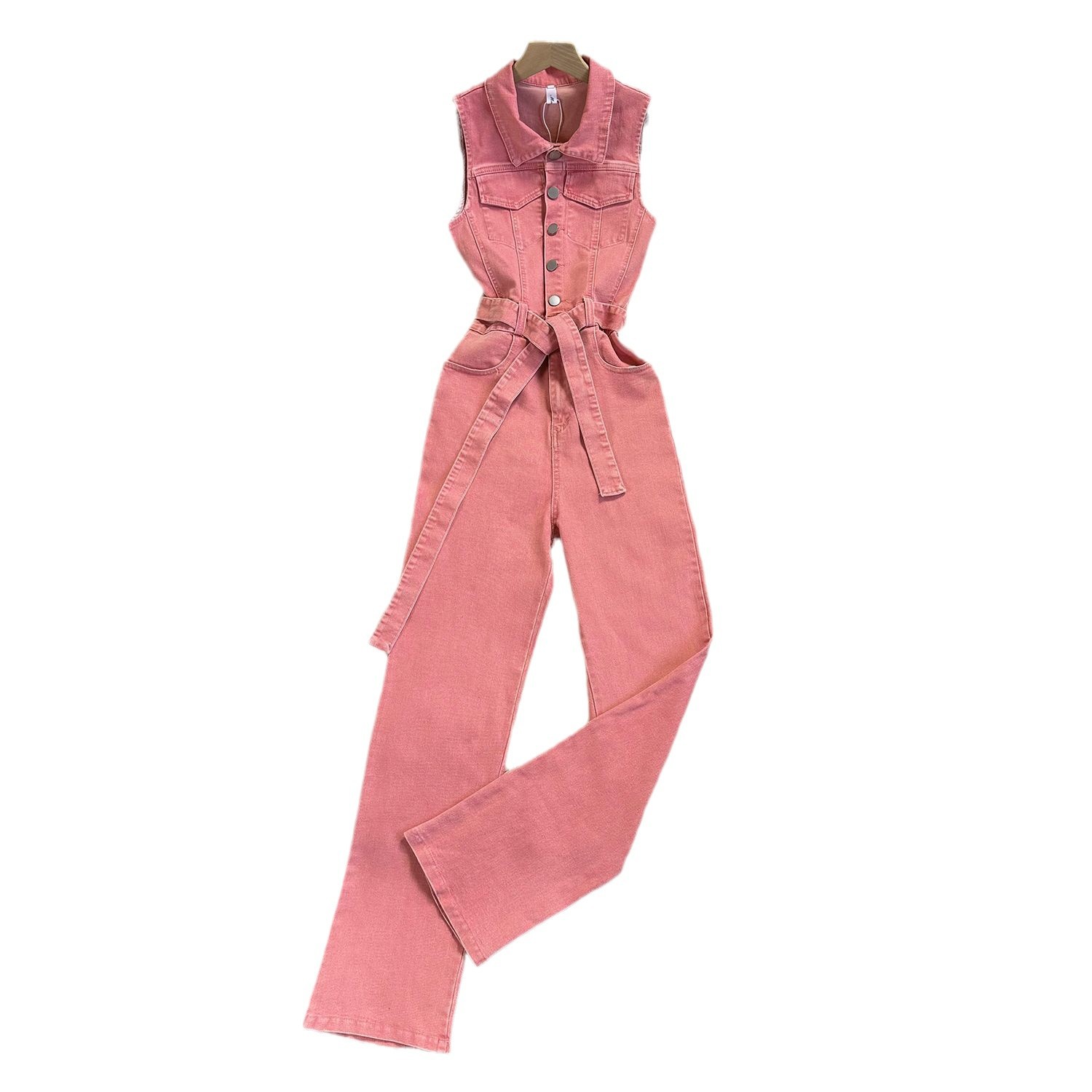 Lace-up Waist-controlled Slim Lapel Metal Buckle Jeans Jumpsuit