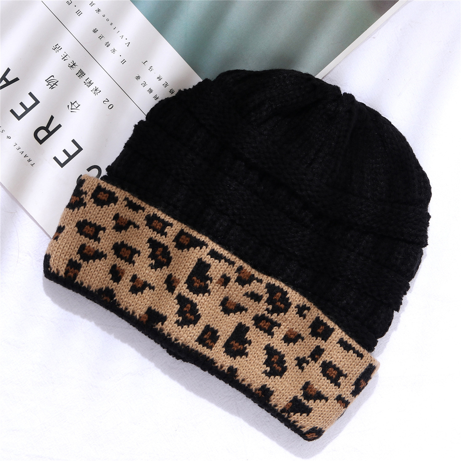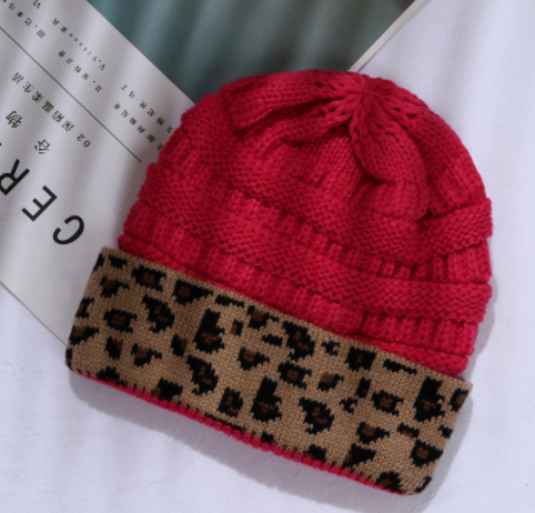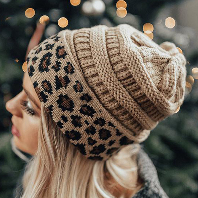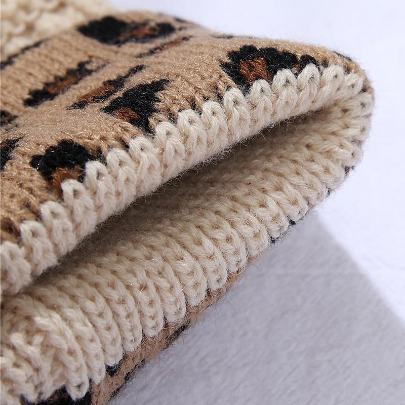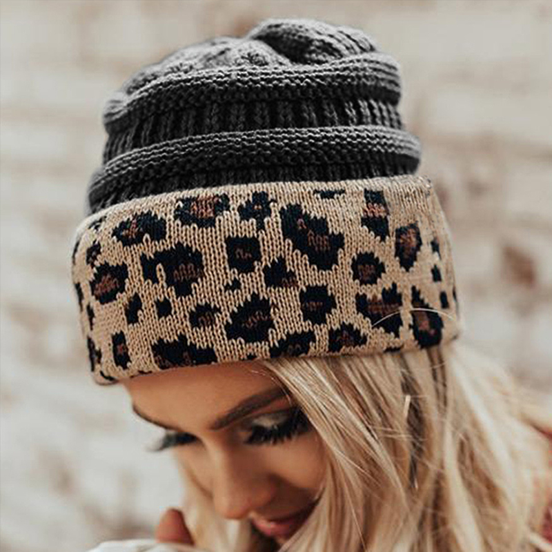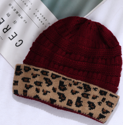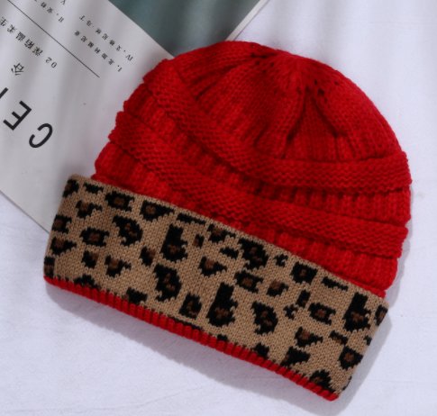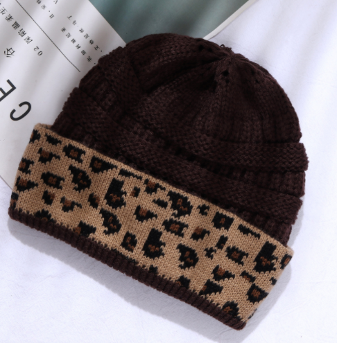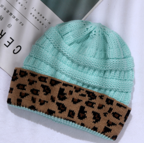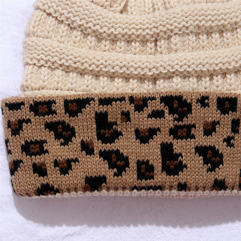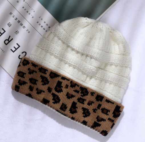 Ladies Autumn Winter Leopard Print Cuffed Acrylic Knitted Hat