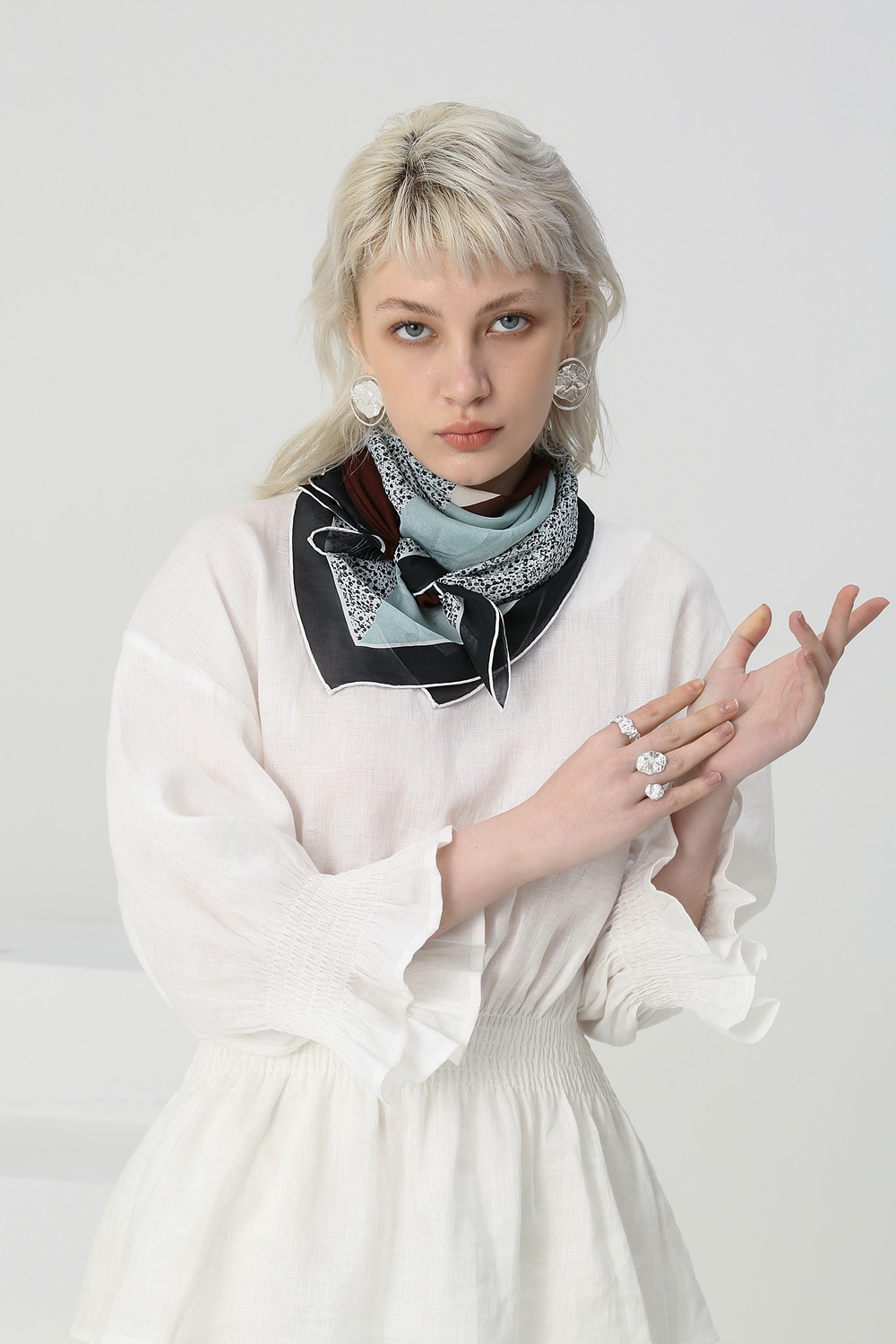 Material: mulberry silk (10mm silk chiffon)Hemming: hand-made hemmingProcess: digital printingSize: 110*110cm (error 1-2cm)