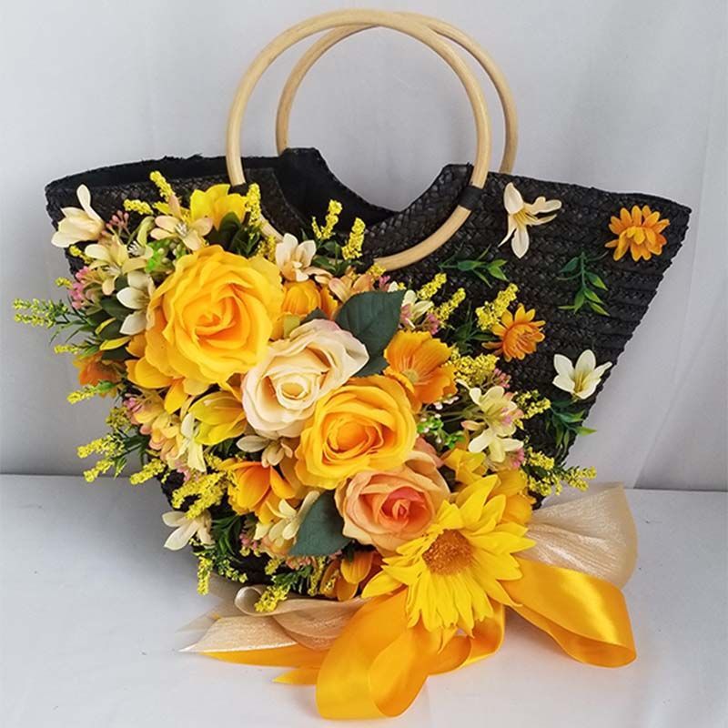 N style: black and yellow rose heavy handmade matching straw bag