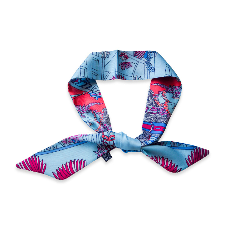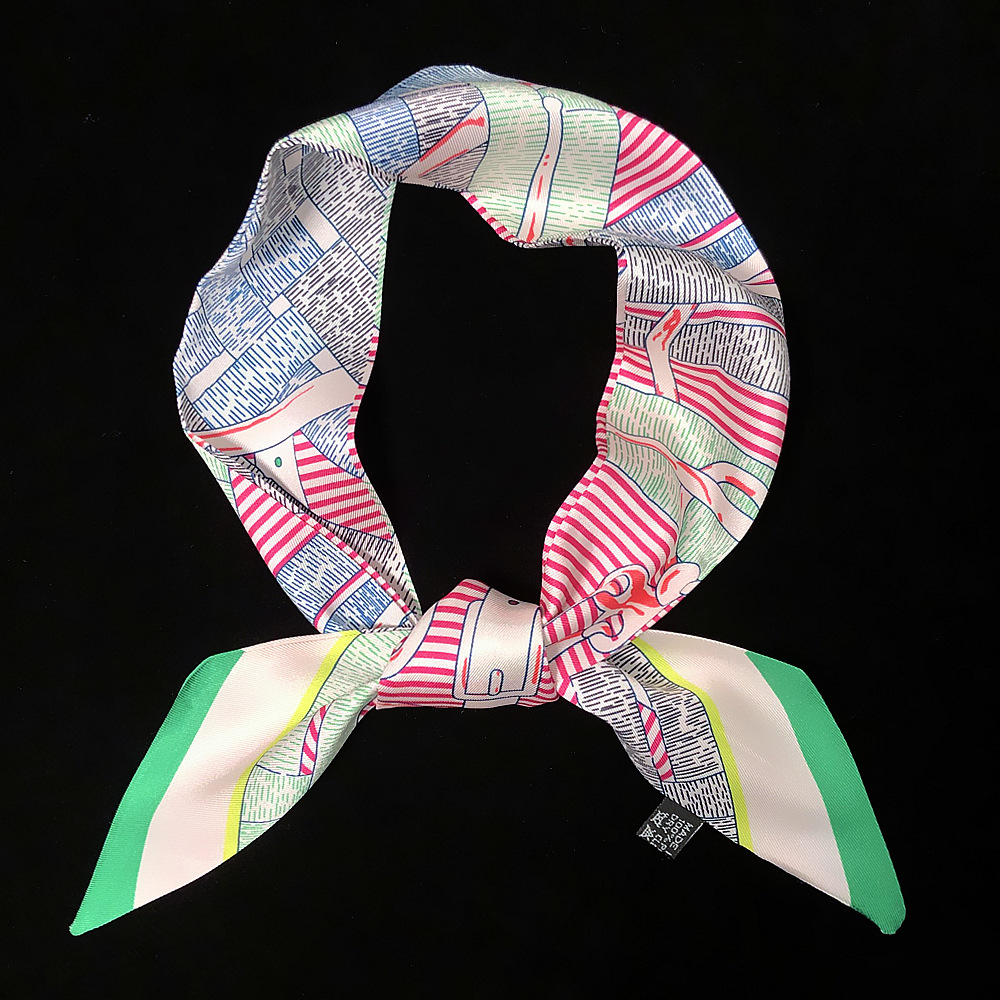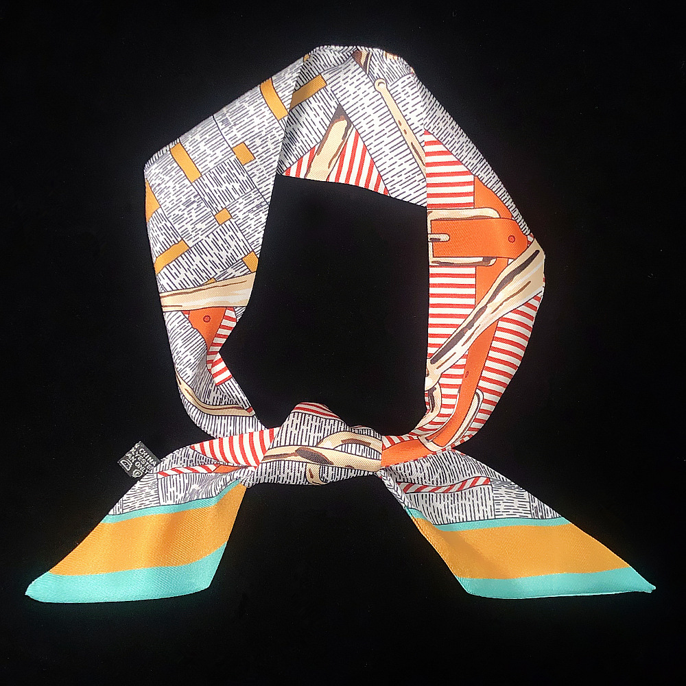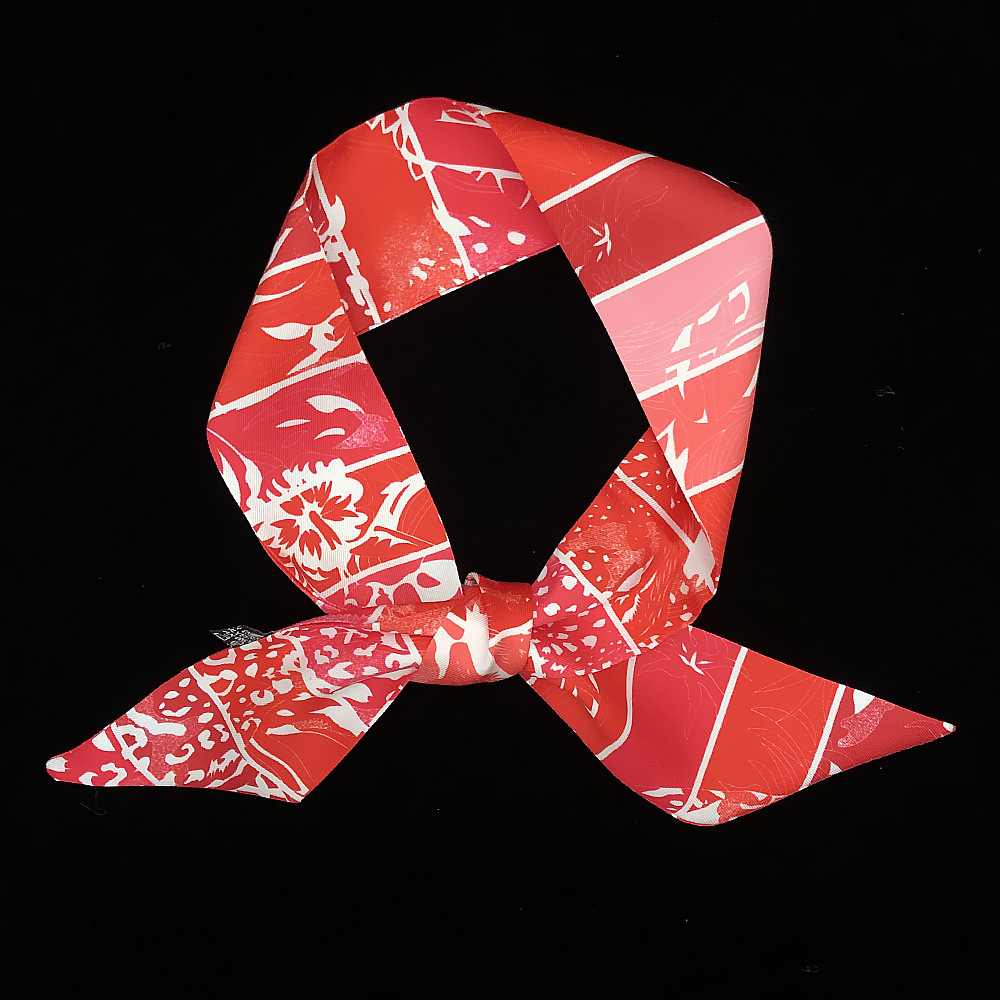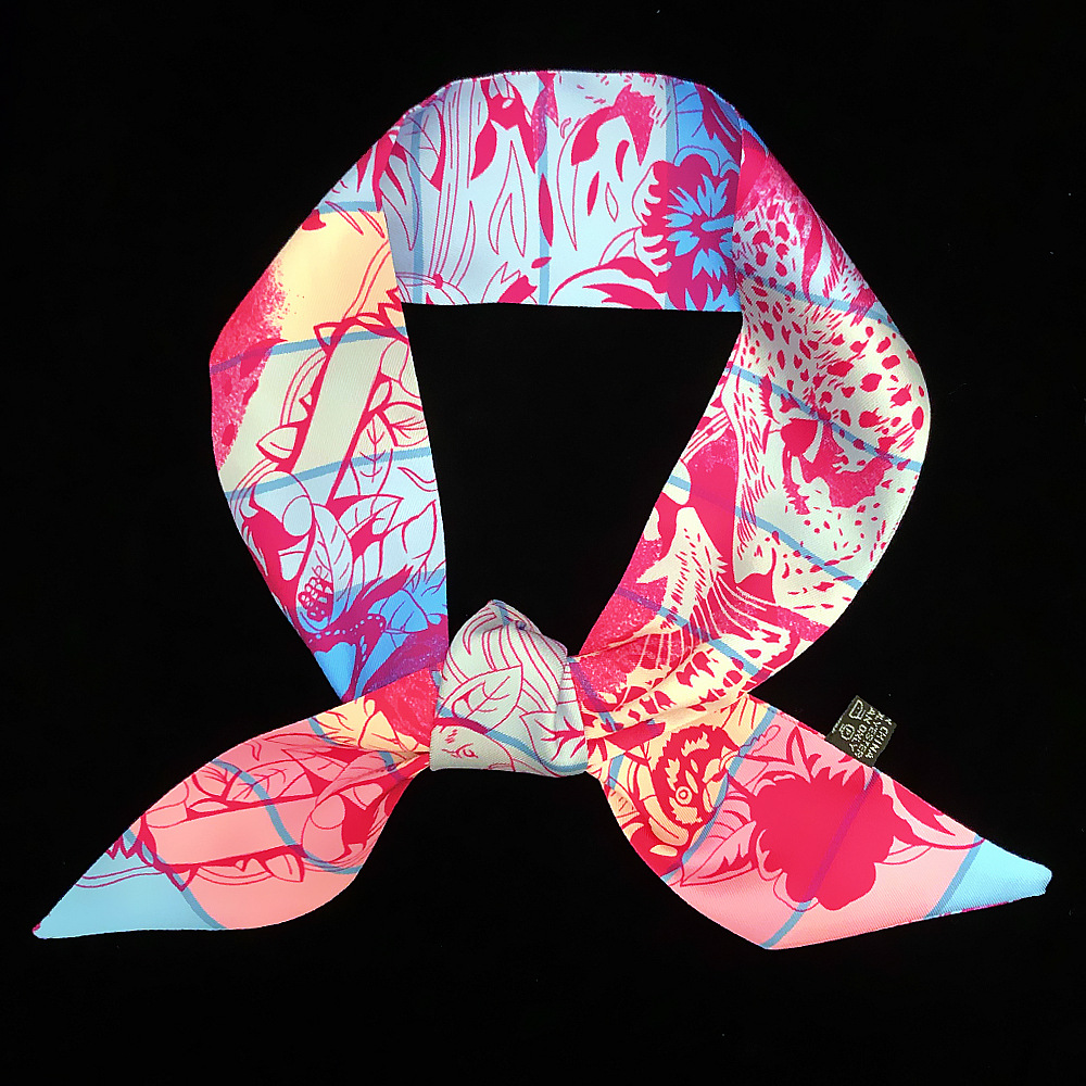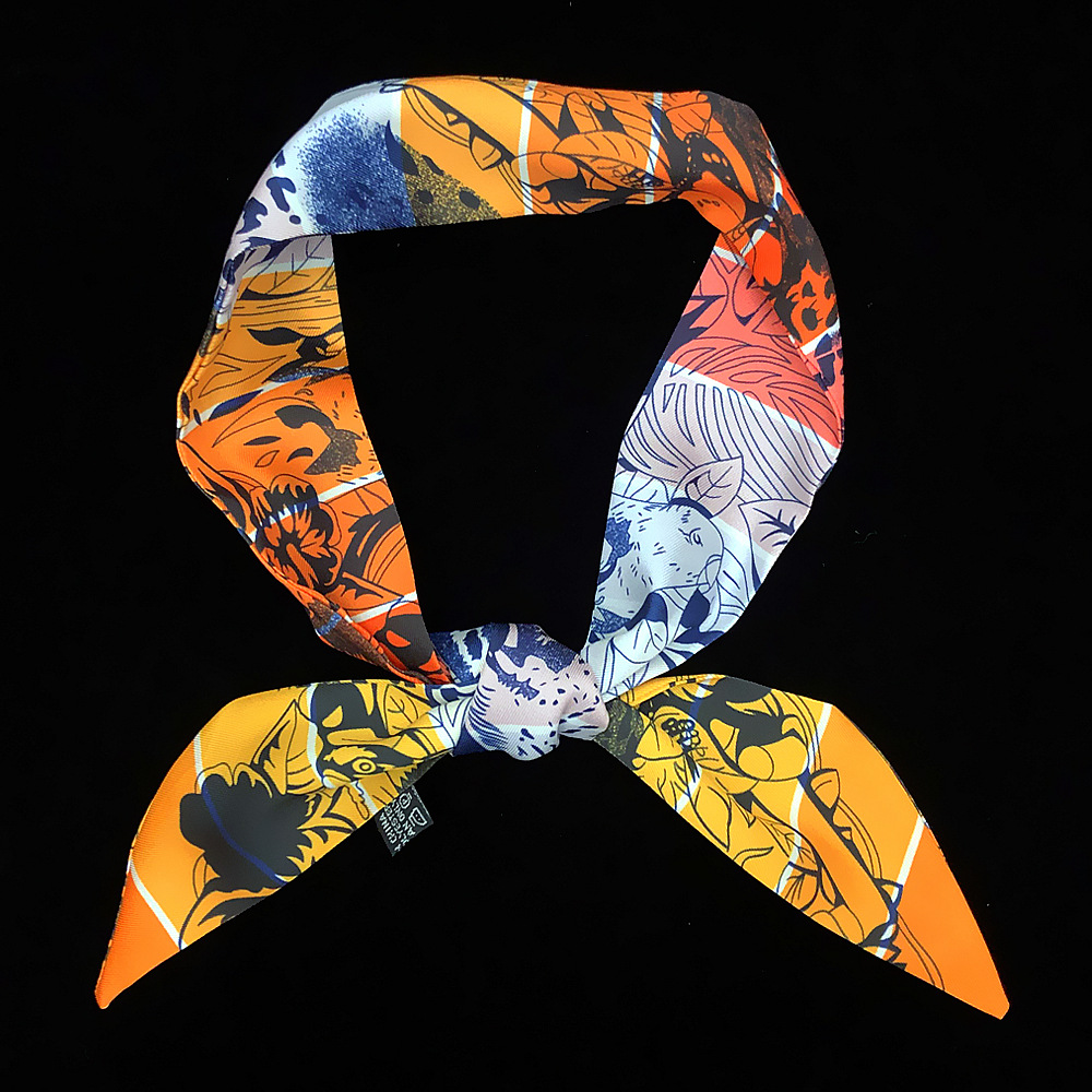Using high-quality heavy twill satin, hand-made, a silk scarf is carefully cut, hand-sewn, hand ironed, and packaged.
