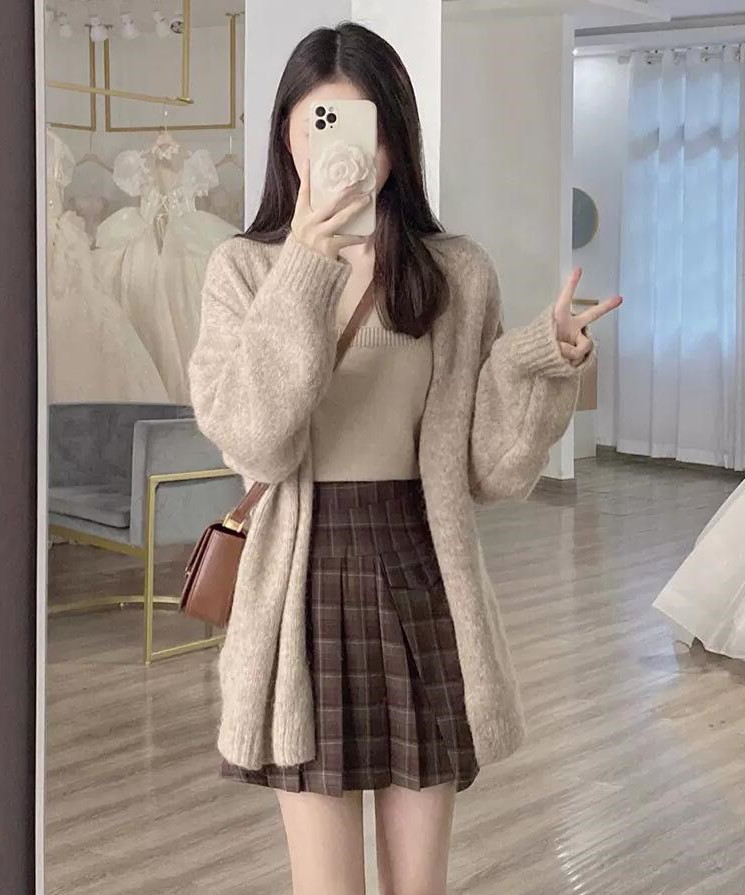 Color: single khaki cardigan, single plaid skirt, single suspenders