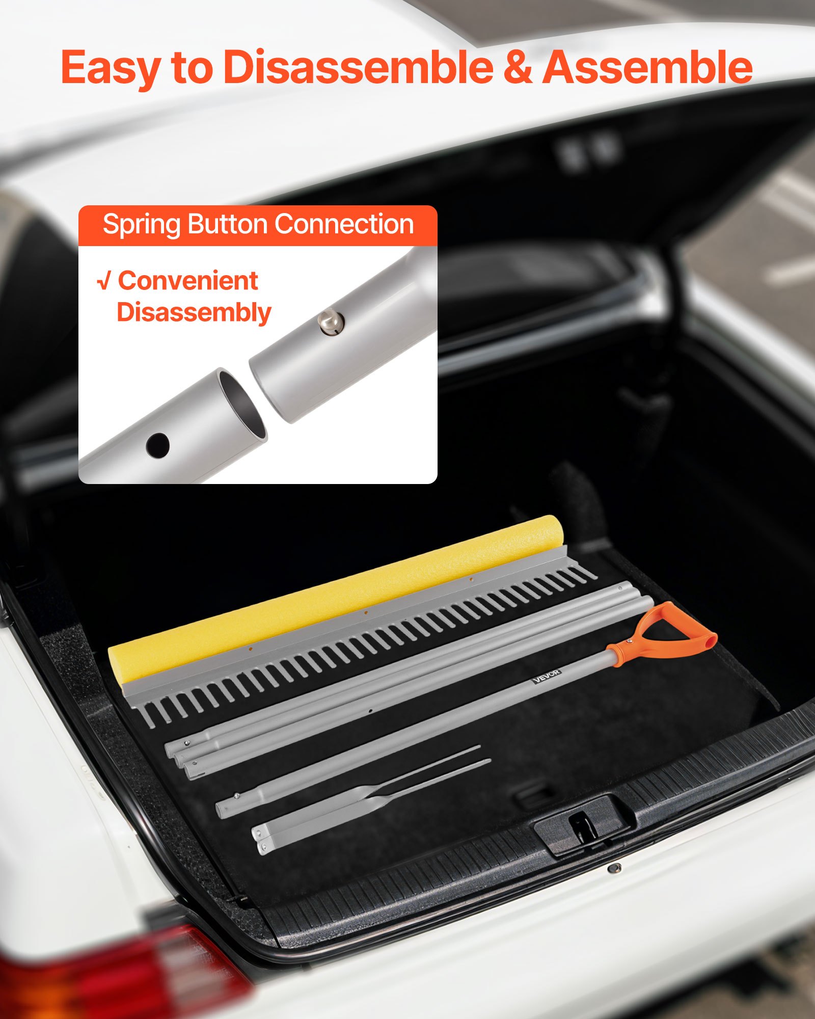 Easy Assembly: This leaf rake requires no complicated assembly steps, saving time and effort. Its four-section spring-lock design allows quick assembly and disassembly, and the handle length can be adjusted to suit different cleaning tasks