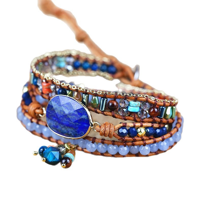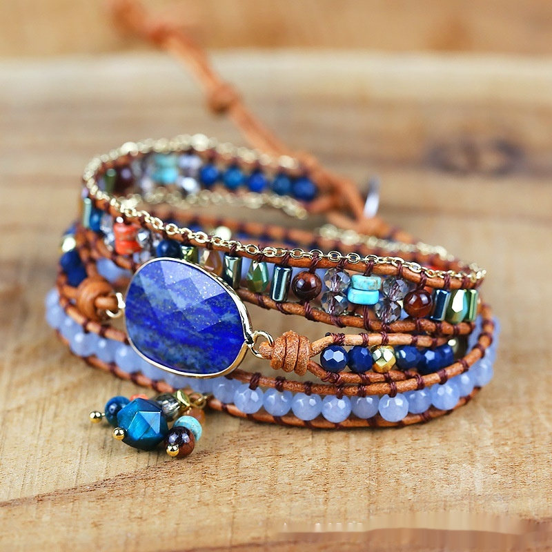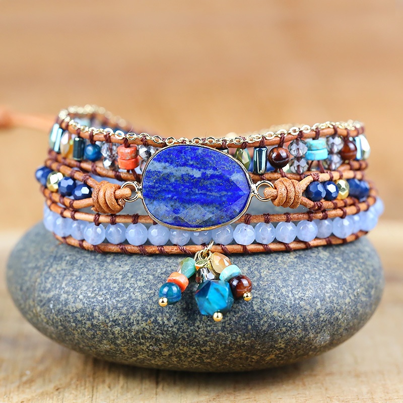Lapis Lazuli Bezel-Set Hand-Knitted Multi-Layer Wax Cord Bracelet