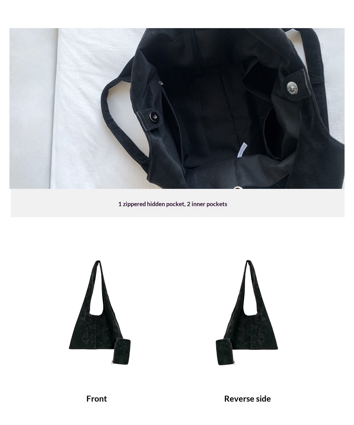 Internal bag structure: hidden zippered pocket, ID card pocket