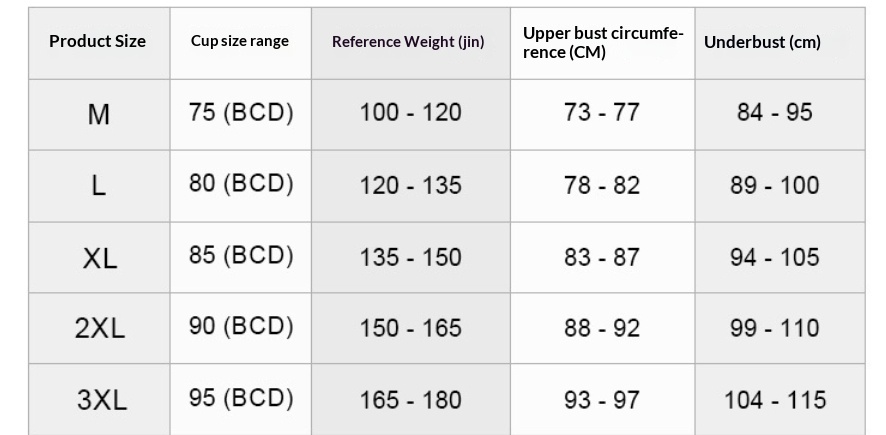 Sizes: M [75 (BCD)], L [80 (BCD)], XL [85 (BCD)], 2XL [90 (BCD)], 3XL [95 (BCD)]