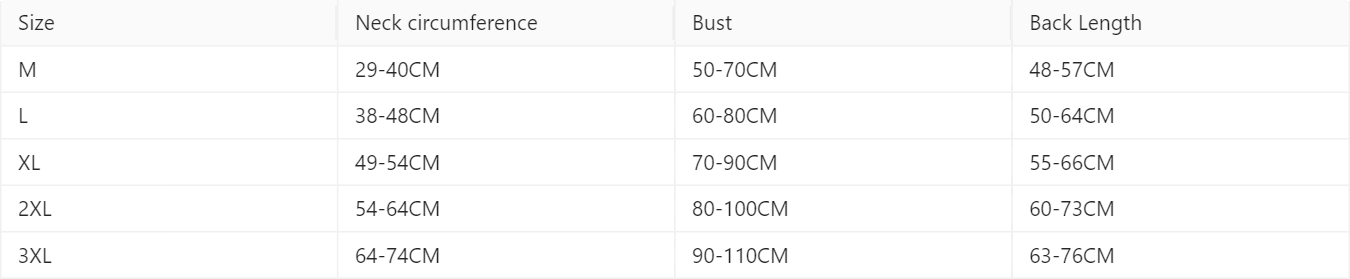 M: 20-35 kg, L: 30-60 kg, XL: 60-80 kg, 2XL: 80-100 kg, 3XL: 90-110 kg