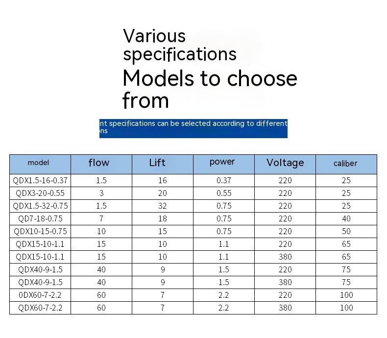 Specifications: QDX1.5-16-0.37KW,QDX1.5-32-0.75KW,QDX1.5-35-1.1KW