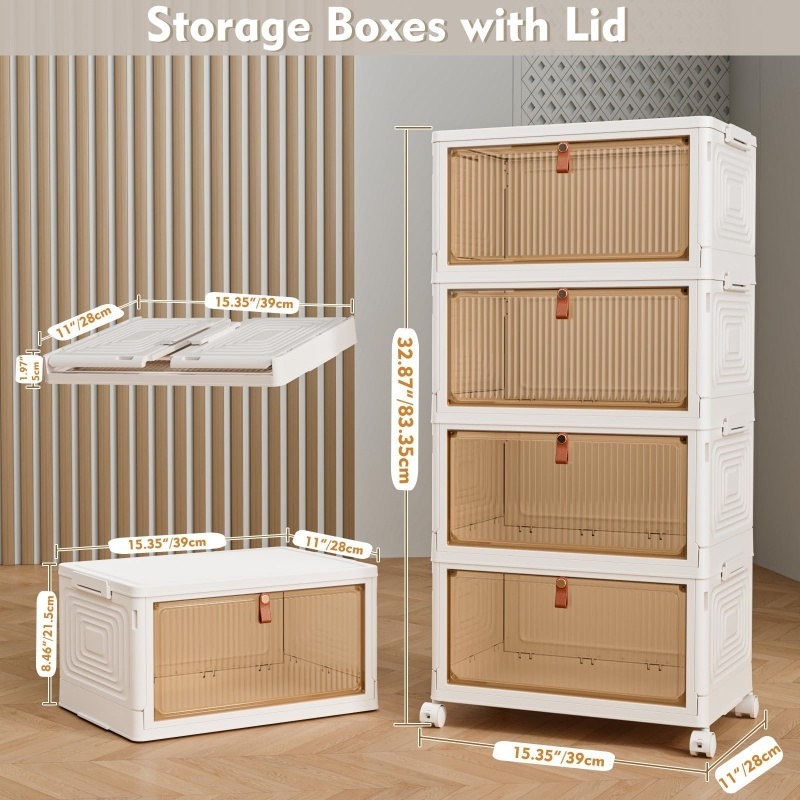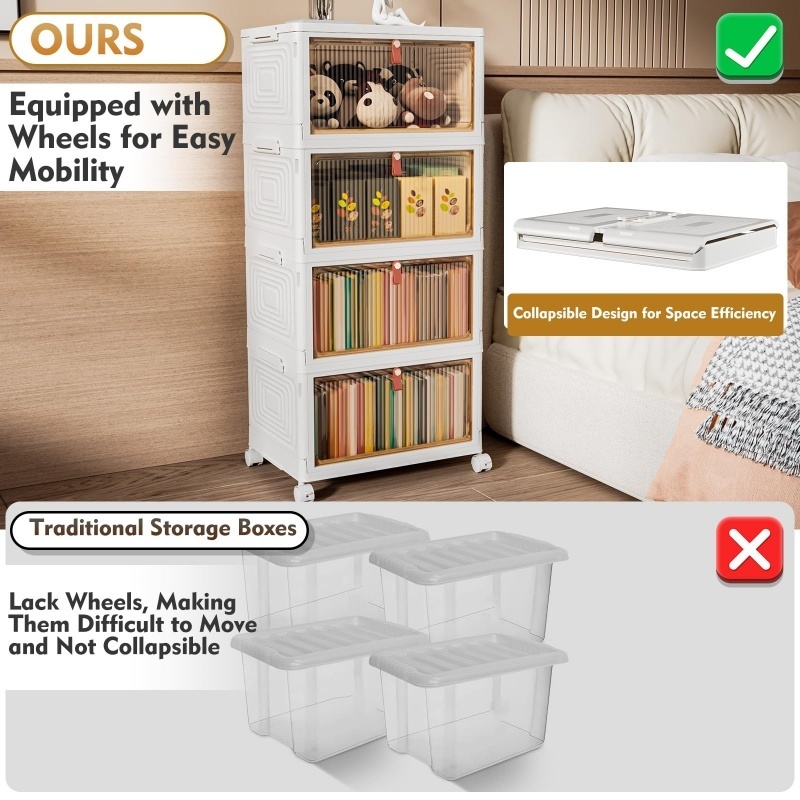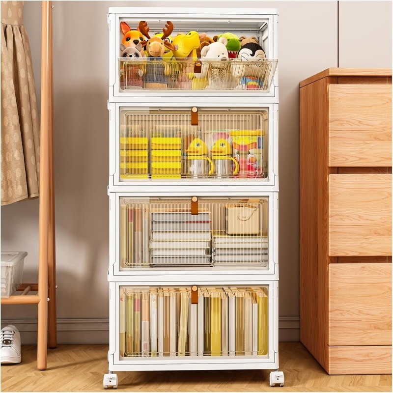 【Large Capacity & Multipurpose】The capacity of each layer of plastic box is 23 liters, and the storage cabinets on the 4 layers can provide more independent storage space for convenient classification and management. This large storage box features stackable boxes, which provides ample storage space for keeping your magazines, books, snack, cosmetics, toys, shoes from dust and allows you to store things in a clean and neat way.
