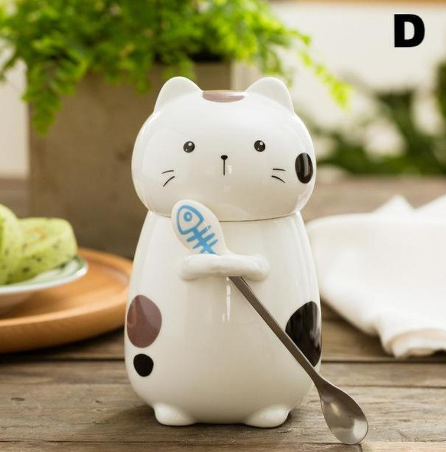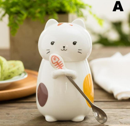 This super adorable mug is made of ceramic, novelty cat shape, colorful painting, with a cute fish stirring spoon, 14-ounce capacity
