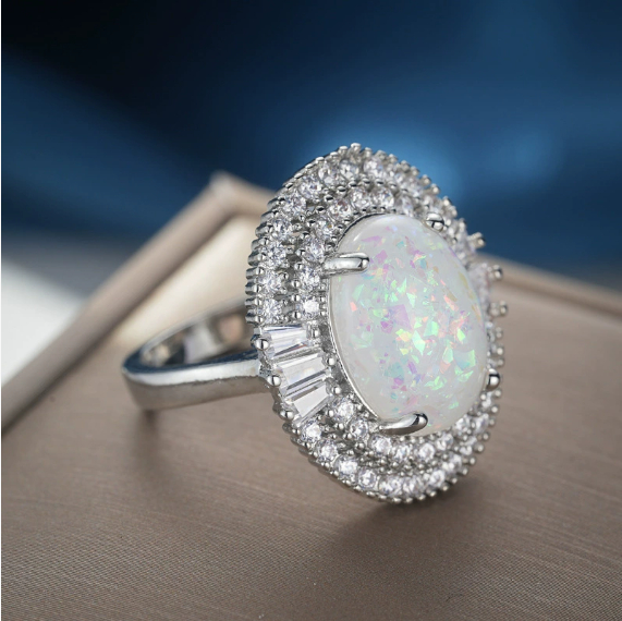 Large Opal Ring Cooperized Silver Over Inlaid Zircon Artificial Opal Jewelry