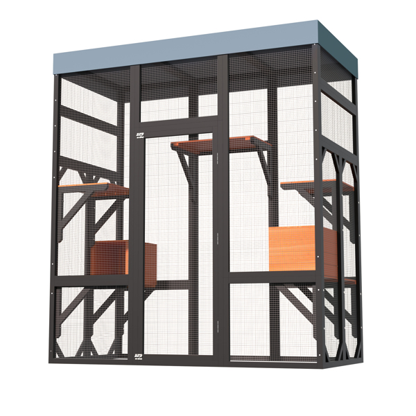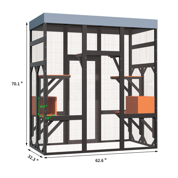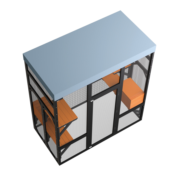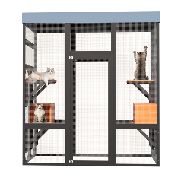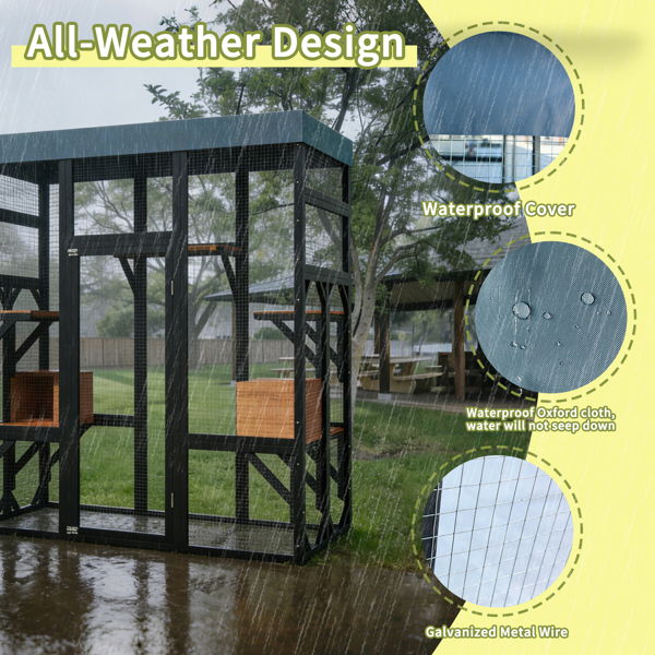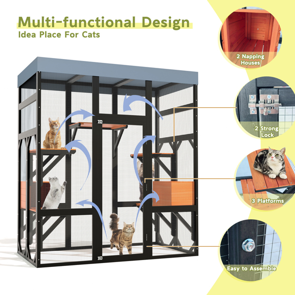 Multi-Functional Cat Activity Center: Designed for climbing, playing, and relaxing, keeping cats active and entertained. Spacious Multi-Level Design: Includes 5 platforms and 2 napping houses, ideal for multiple cats. Safe & Secure Construction: Durable frame, wire mesh, and 2 locks keep cats protected. Indoor & Outdoor Use:The top of this enclosure is crafted with a premium, high-quality waterproof fabric designed to shield your pets from rain and harsh weather conditions. Easy Assembly & Access:Simple setup with large doors for easy feeding and cleaning.