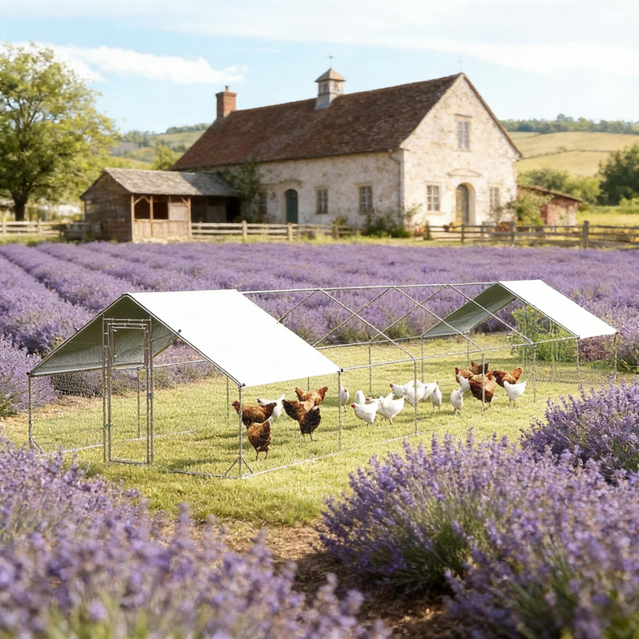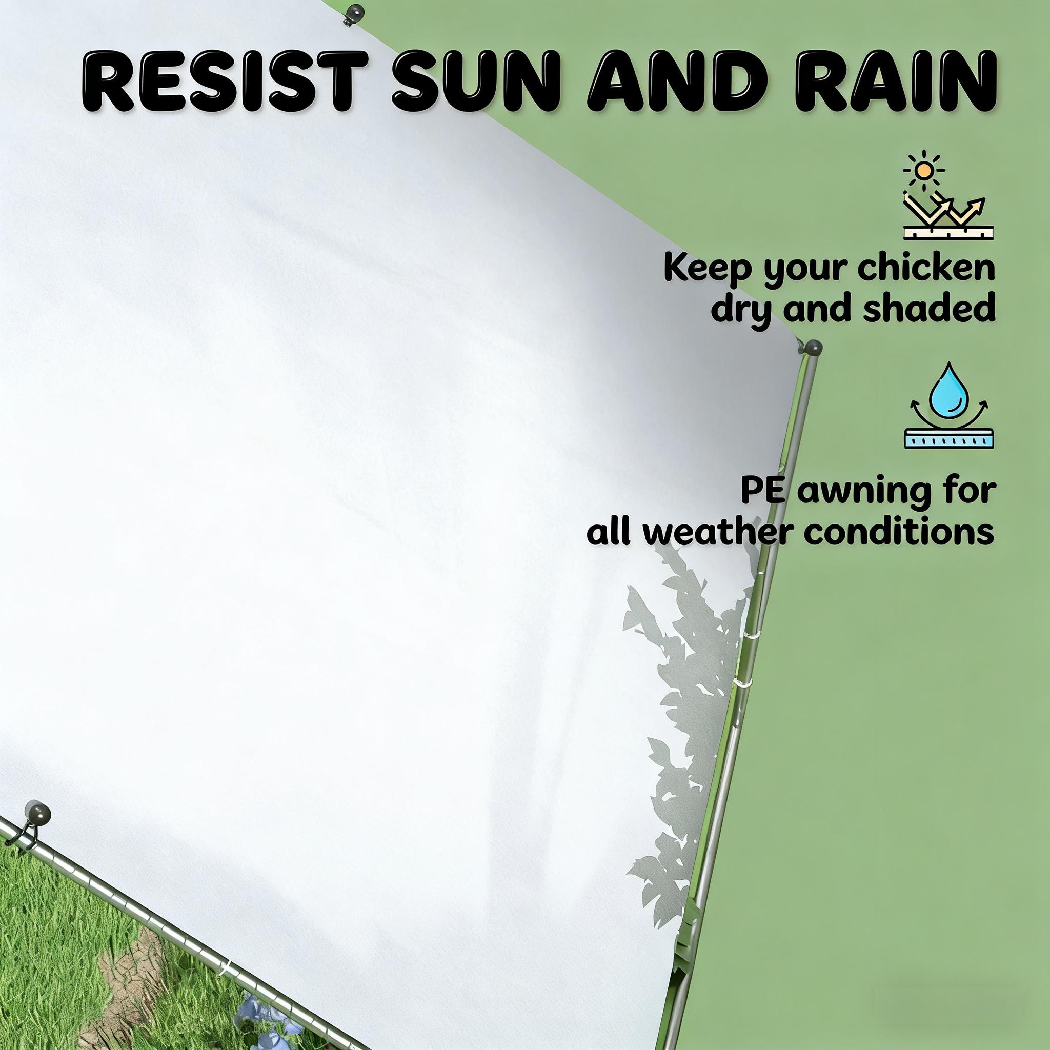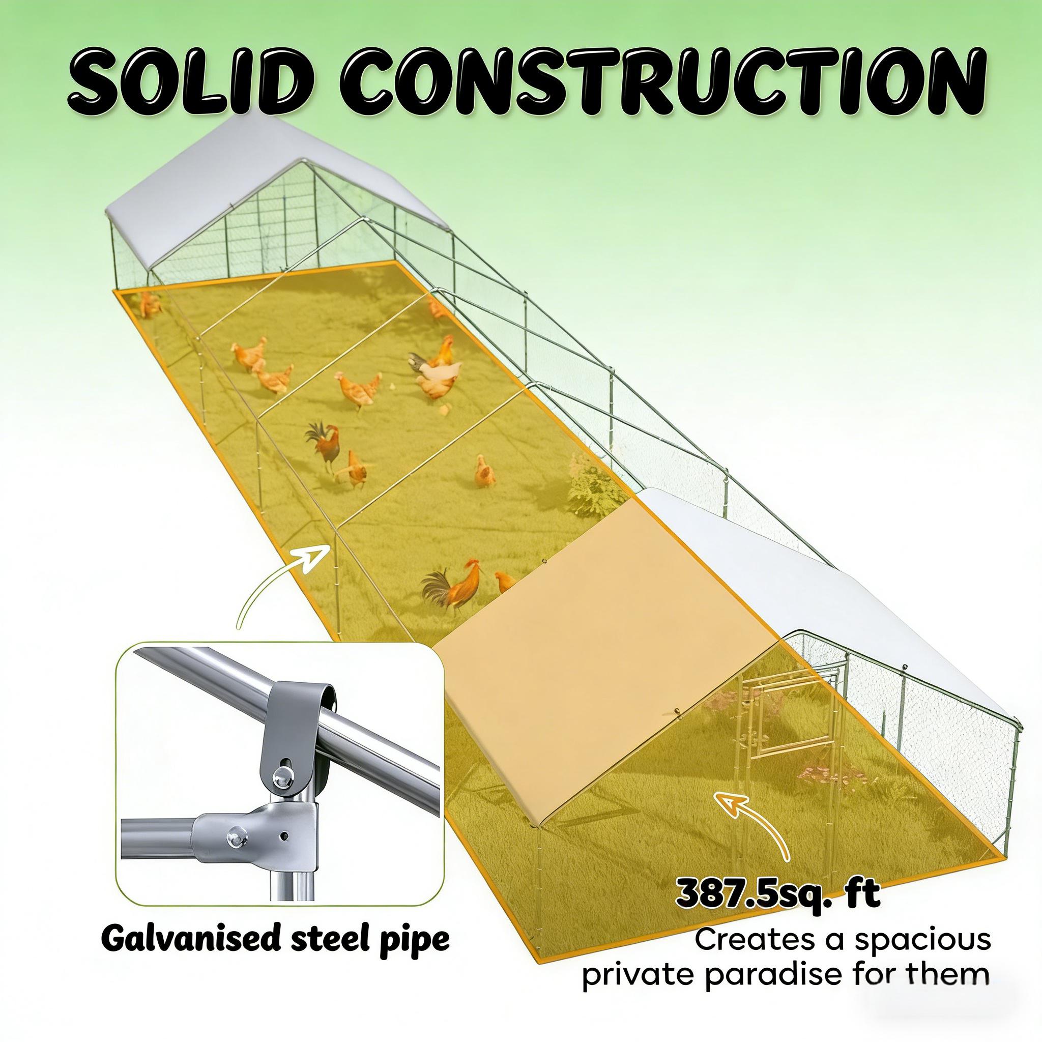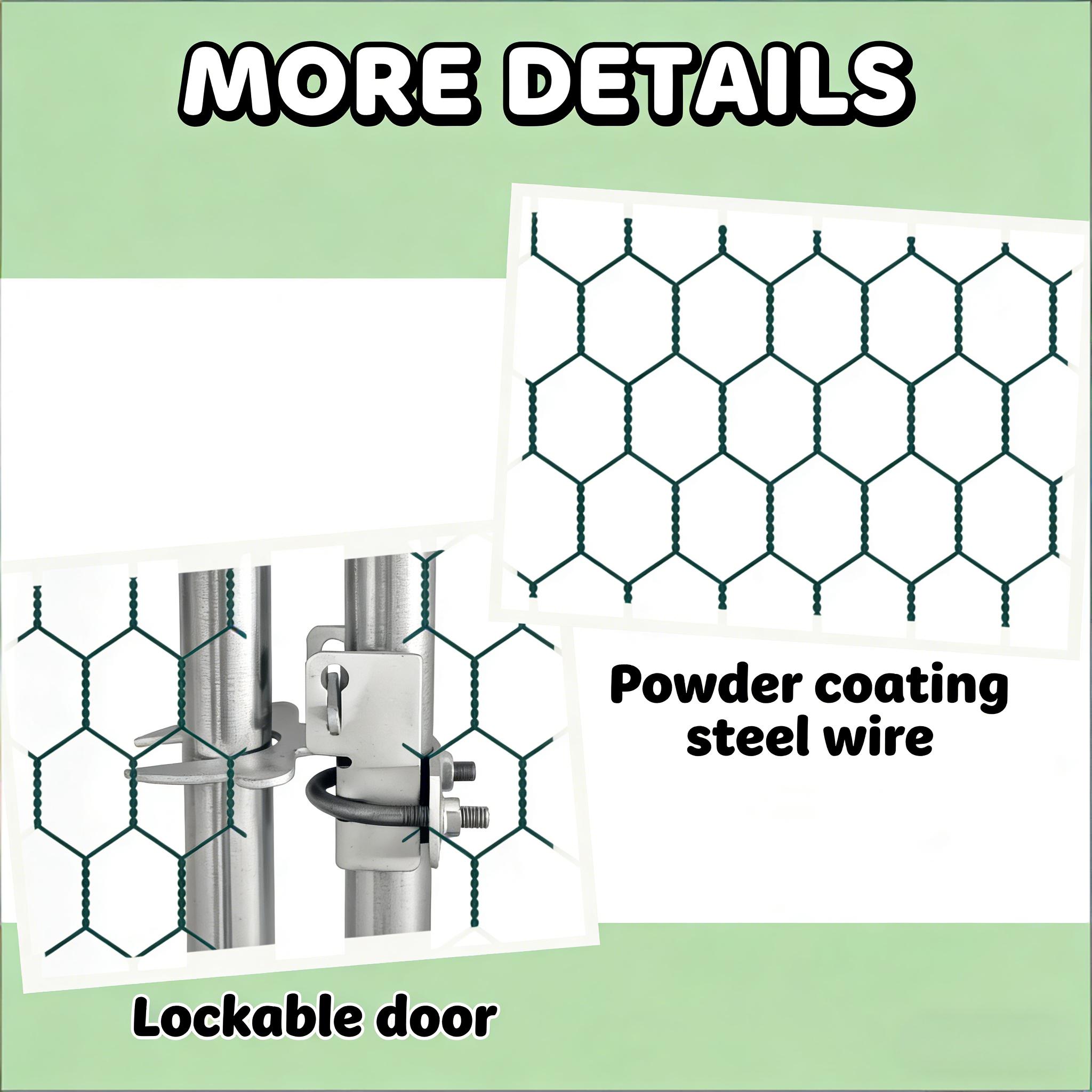 Features: - Suitable for raising chickens, rabbits, ducks, and other animals - Robust construction made from solid galvanized steel - Steel hexagonal mesh offers excellent protection for your animals - Lockable galvanized door adds an extra layer of security for your chicken - Included cover provides shade during sunny days - Designed for use with wooden cages, making it a versatile addition to your chicken care setup - Small feeding door allows you add food without opening the main door - Suitable for 36-50 Chickens Specification: - Color: Silver - Material: Galvanized Steel, 420D Oxford Cloth - Overall Dimension: 39.4' L x 9.8' W x 6.4' H - Eaves Height: 3.6' - Cover: 11.5' Lx 6.6' W - Large Door: 22" W x 63" H - Small Door: 17.7" W x 16.5" H Package Includes: - 1 x Chicken Coop - 1 x Manual
