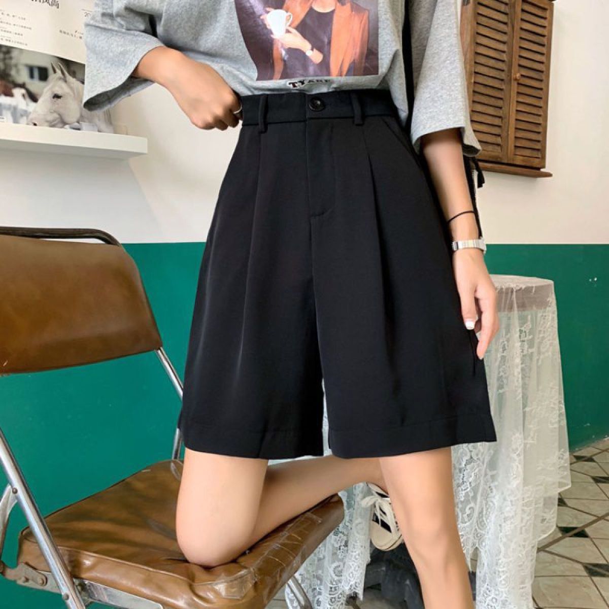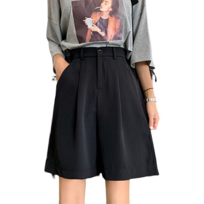 Large Size Casual Wide-leg Loose-fitting Thin High-waist Five-point Suit Black Five-point Pants