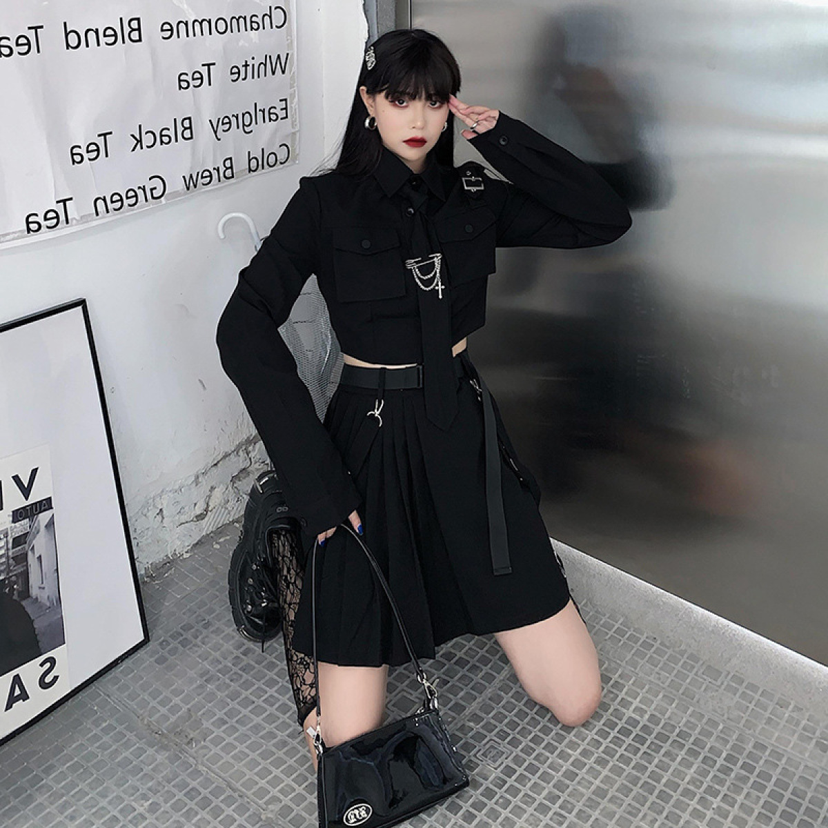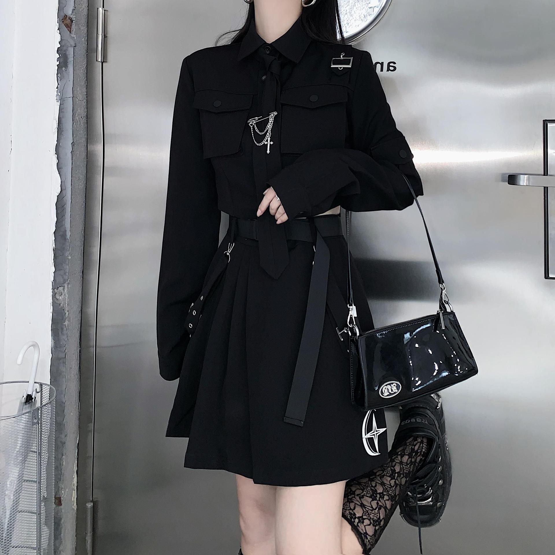 Color: black shirt, black skirt, black two-piece suit