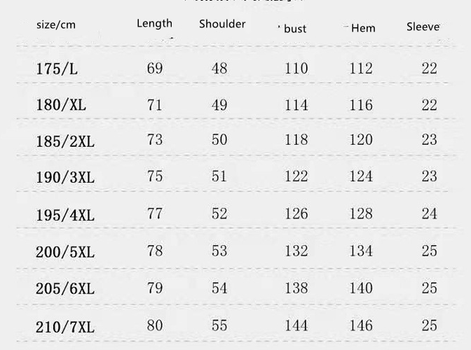 Size: L, XL, XXL, XXXL, XXXXL, 5XL, 6XL, 7XL