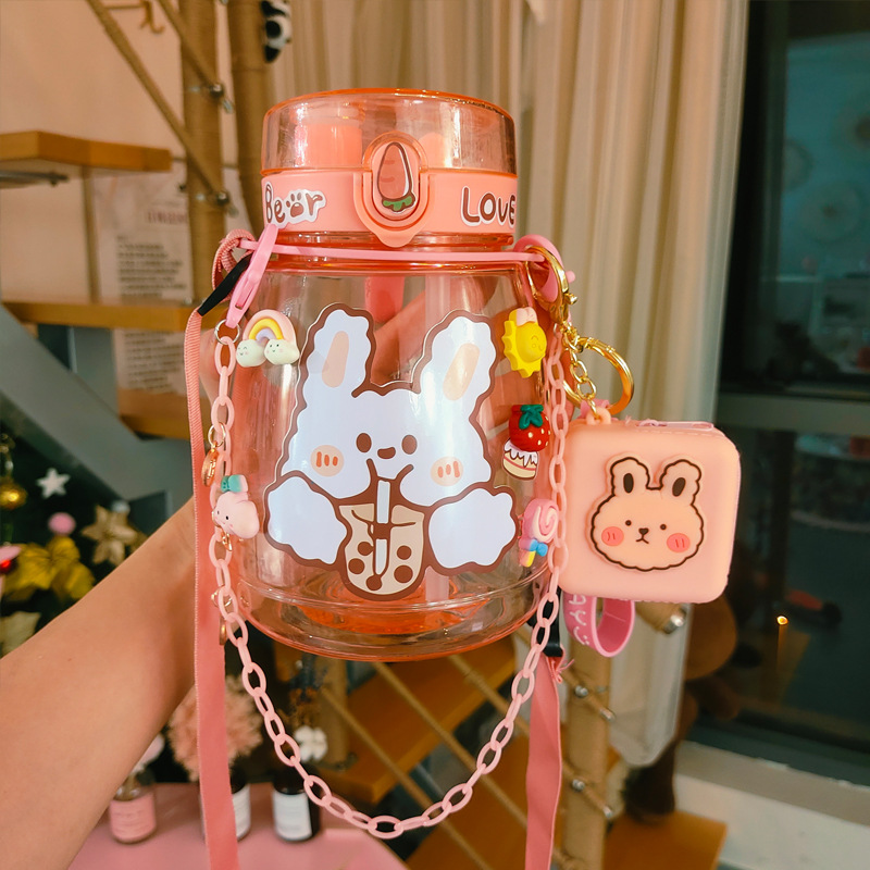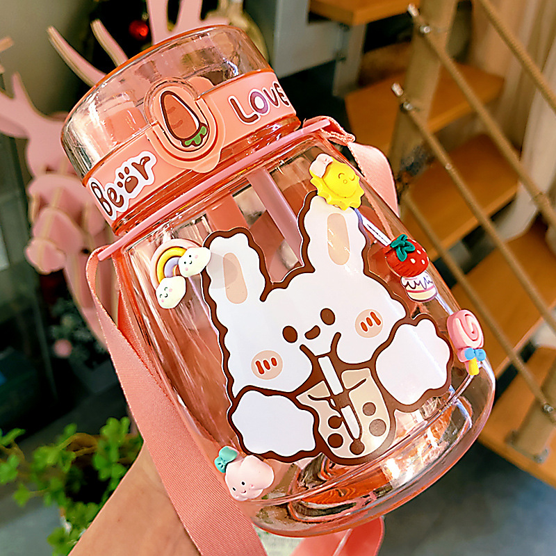 Cartoon fashion water bottle with shoulder strap, easy to carry.