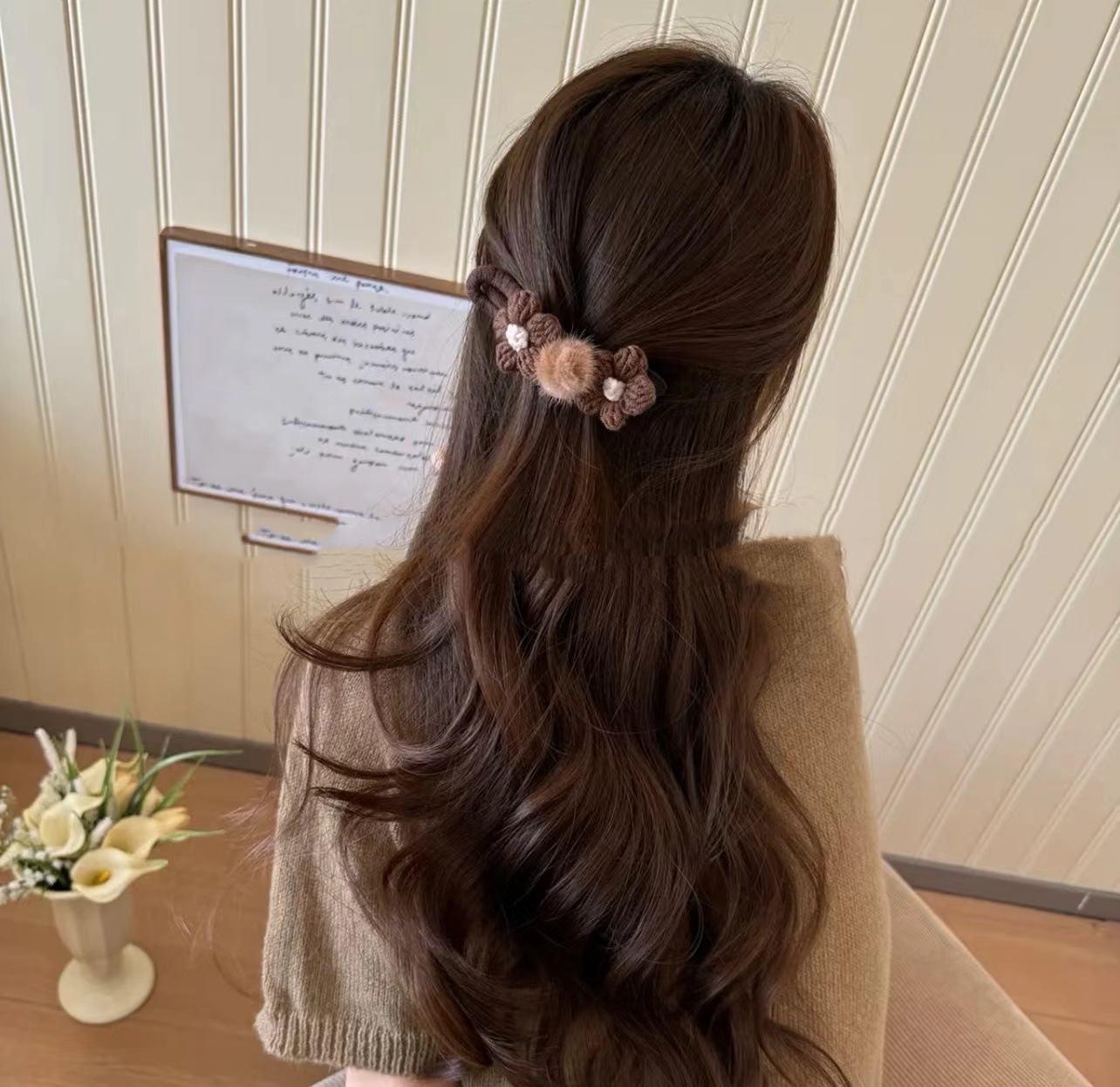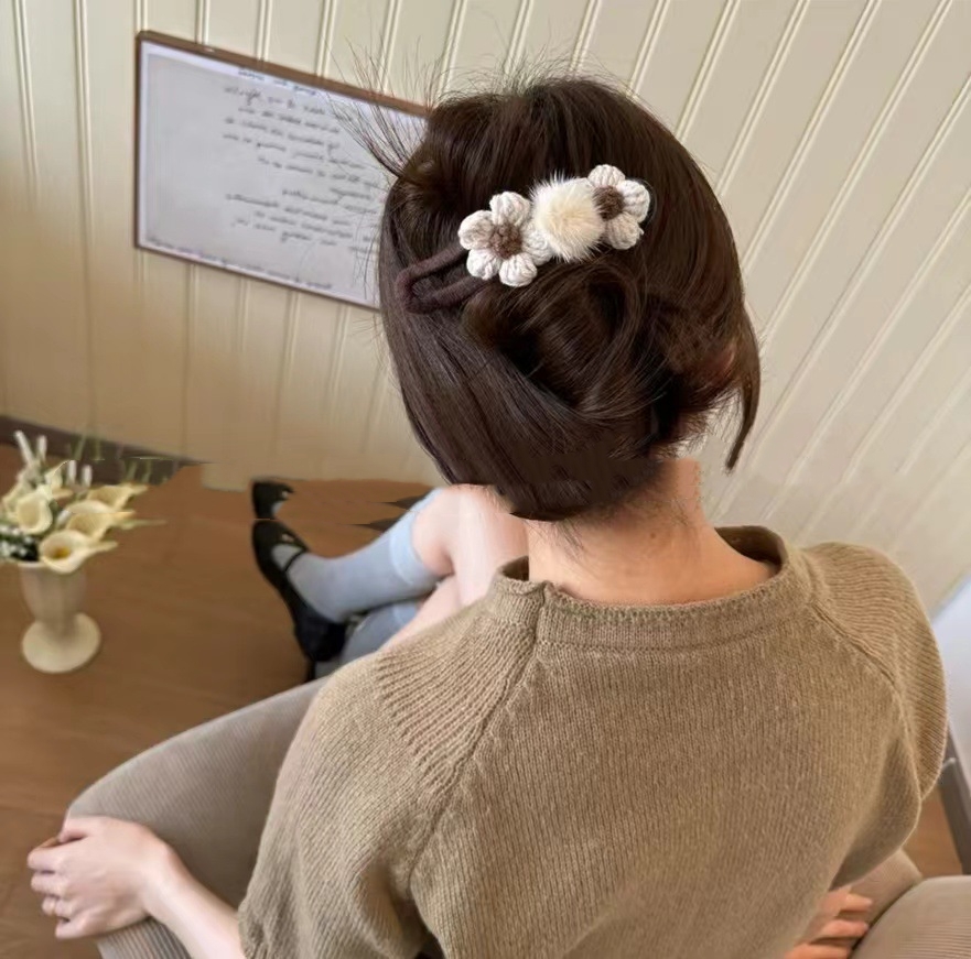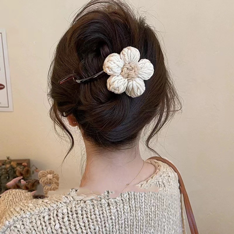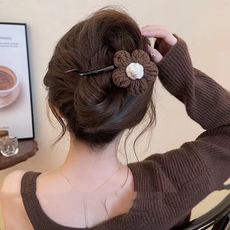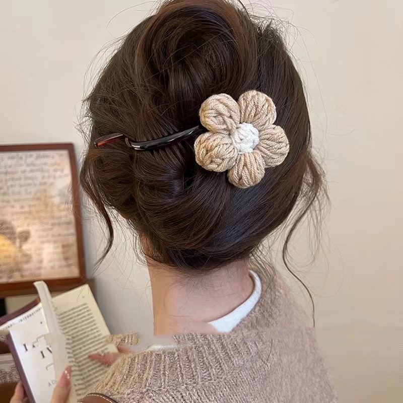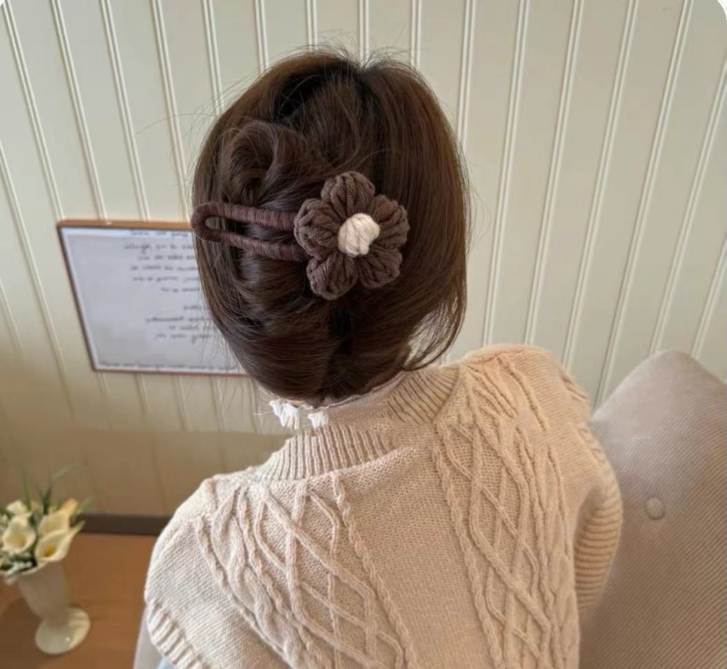 Color: light coffee knitted flower banana clip, dark brown knitted flower banana clip, beige knitted flower banana clip, beige knitted flower duckbill clip, light coffee knitted flower duckbill clip, dark brown knitted flower duckbill clip, beige knitted double flower duckbill clip, deep coffee knitted double flower duckbill clip