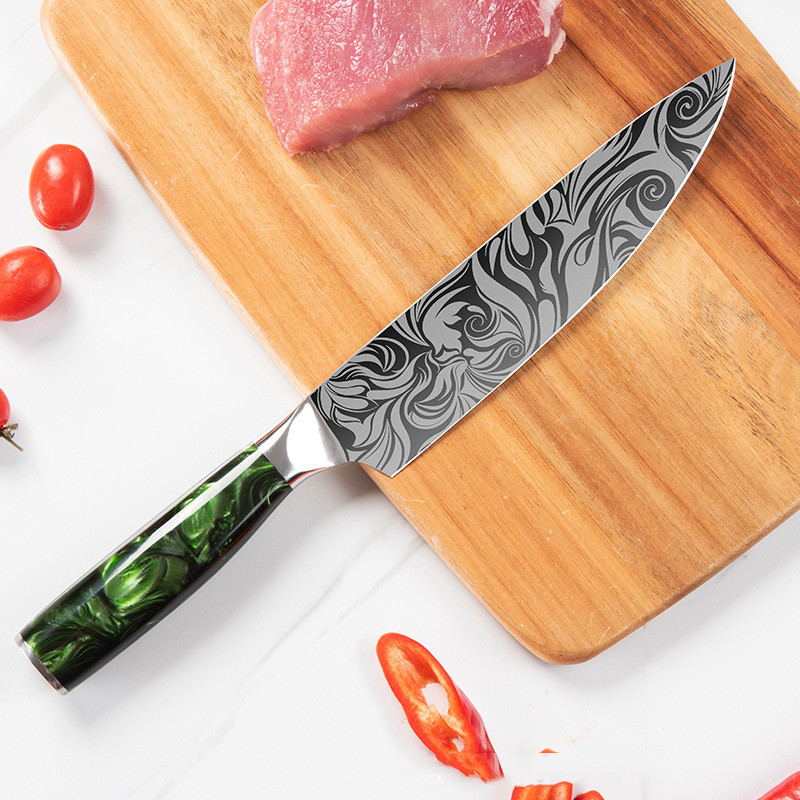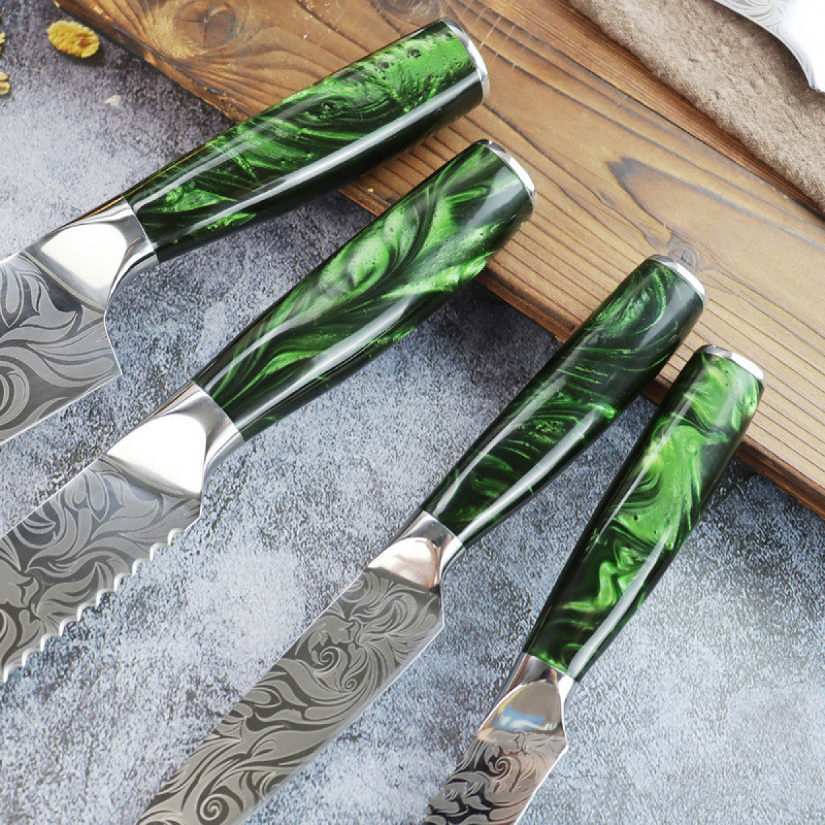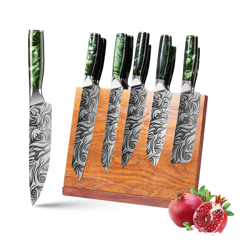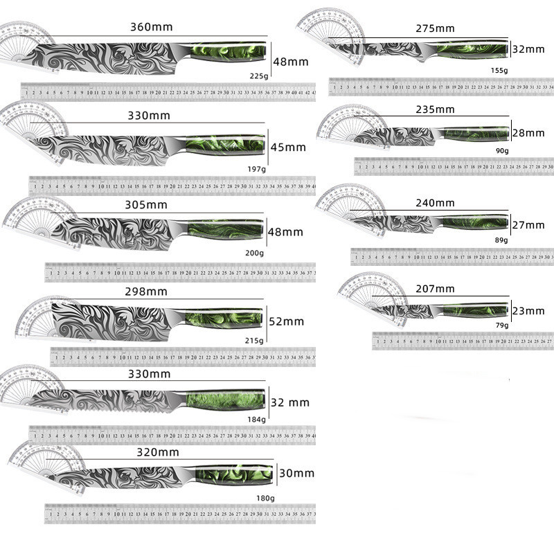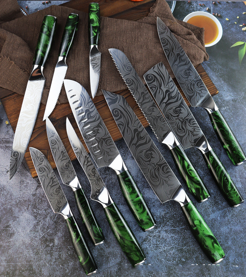 Specification: 10-piece set, 9-inch cutting knife, 8-inch chef knife, 8-inch bread knife, 8-inch meat knife, 7-inch kitchen knife, 7-inch Sande knife, 6-inch bone cutting knife, 5-inch small Sande knife, 5-inch universal knife, 3.5-inch peel knife