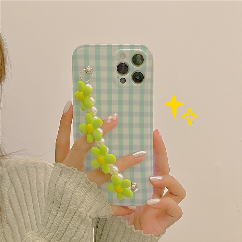 Applicable brand: AppleStyle: back coverMaterial: tpuColor: Green Plaid + Flower Bracelet, Pink Plaid + Flower Bracelet