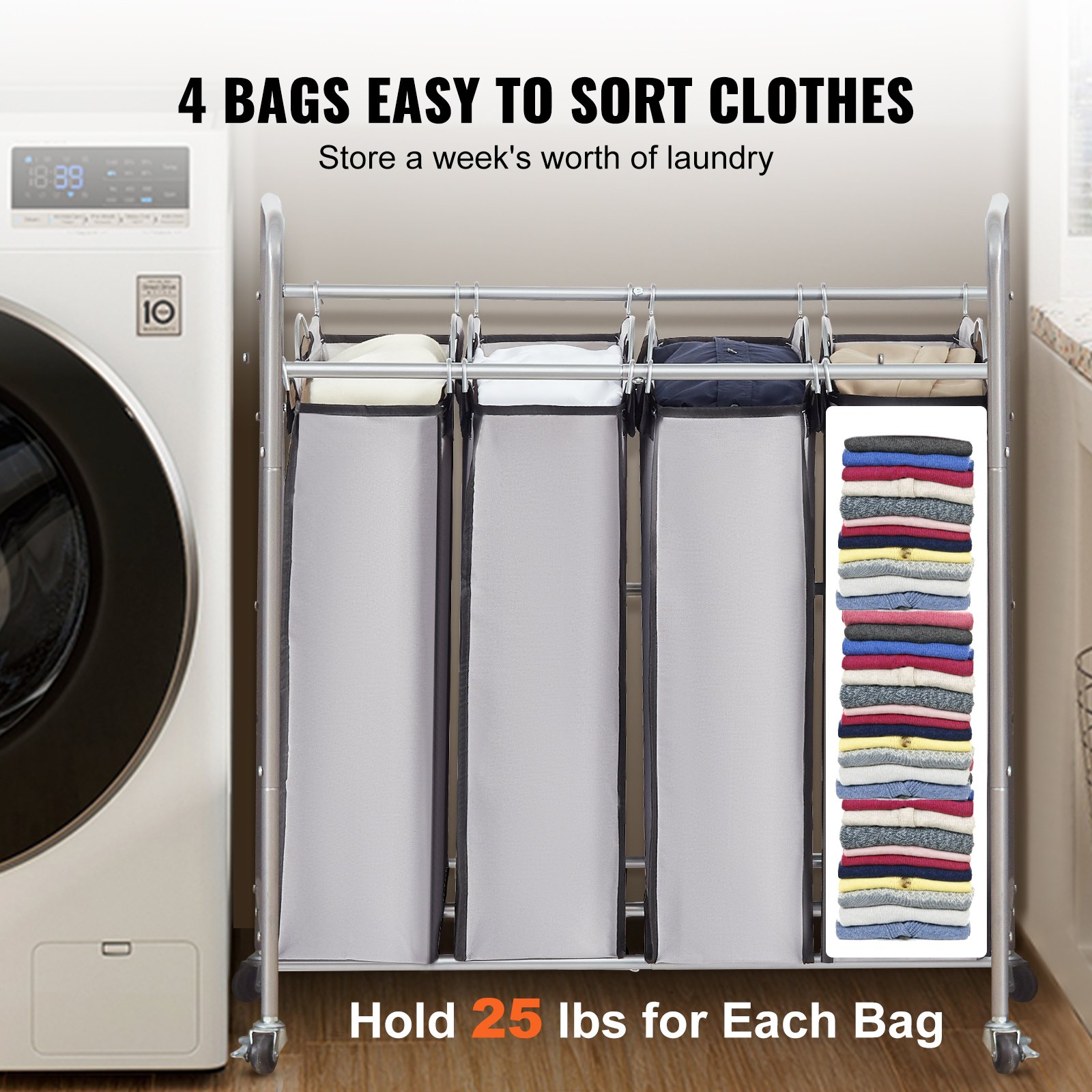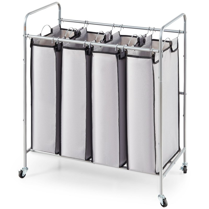 Features & Details Heavy-Duty Frame and Bags: Simplify your laundry routine with the remarkable laundry sorter cart. Its heavy-duty 600D Oxford cloth bags are waterproof and easy to clean, while the thickened metal frame and 6 horizontal bars provide enhanced stability. Ample Storage Capacity: The dimension of 4 section laundry sorter : 30.1"L x 16"W x 34.1"H, each laundry bag dimension:13.6"L x 6.5"W x 23.2"H. Each heavy-duty bag holds up to 25 lbs of clothes, providing ample space for clothes, towels, bedding, and other laundry items, keeping them organized and easily accessible. 4 Removable Bags: Each laundry bag can be taken out individually from the rolling laundry cart, use the two metal handles to lift the laundry bag for easy access to the laundry room. 4 bags make it easy to sort your clothes. Easy to Move Around: Equipped with 4 smooth-rolling casters, our laundry hamper with wheels ensures effortless movement, making it easy to pick up laundry from every room. Two locking casters provide stability when parked. Ultra-practical Laundry Cart: The VEVOR laundry sorter cart offers the perfect solution for all your laundry needs, ensuring everything is organized and easily accessible. Whether it's for your laundry room, bedroom, entryway, living room, small apartment, or dorm, this cart is an excellent choice to streamline your laundry routine.