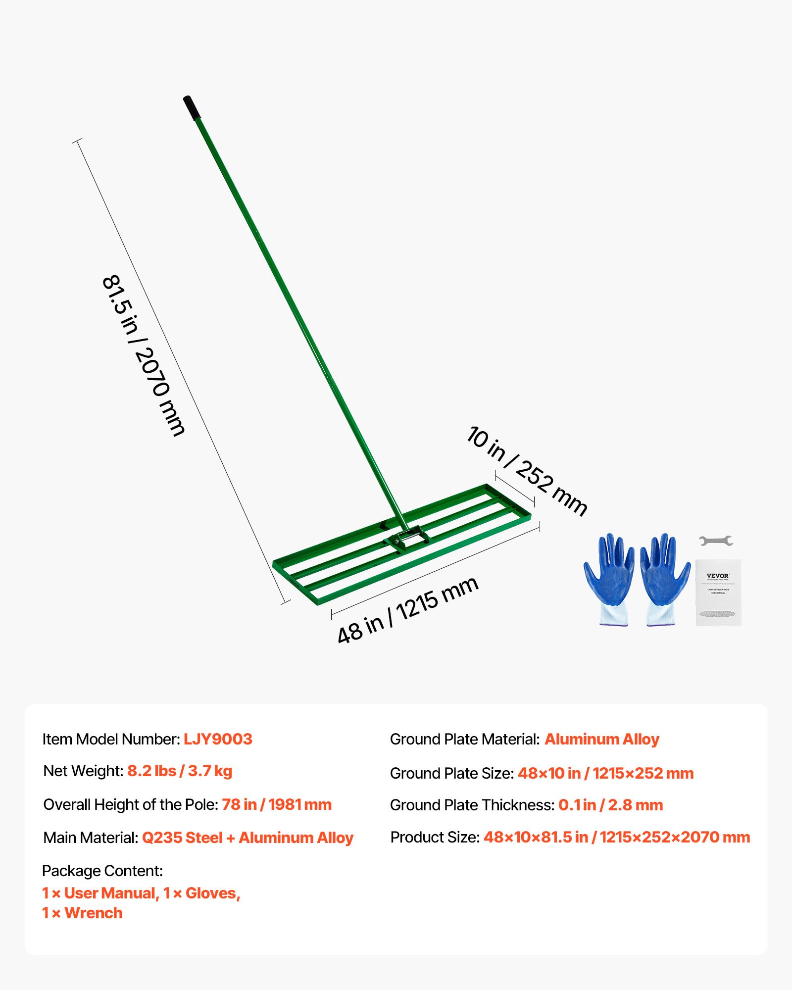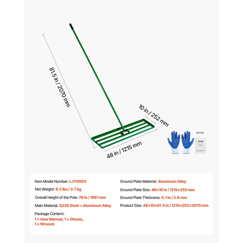 Large-Sized Lawn Leveling Rake: VEVOR's level lawn tool with a 48x10 inch ground plate, swiftly and effectively levels the ground, saving time and effort. Suitable for various terrains like lawns, farms, gardens, and golf courses for leveling sand, soil, compost, and moss.
