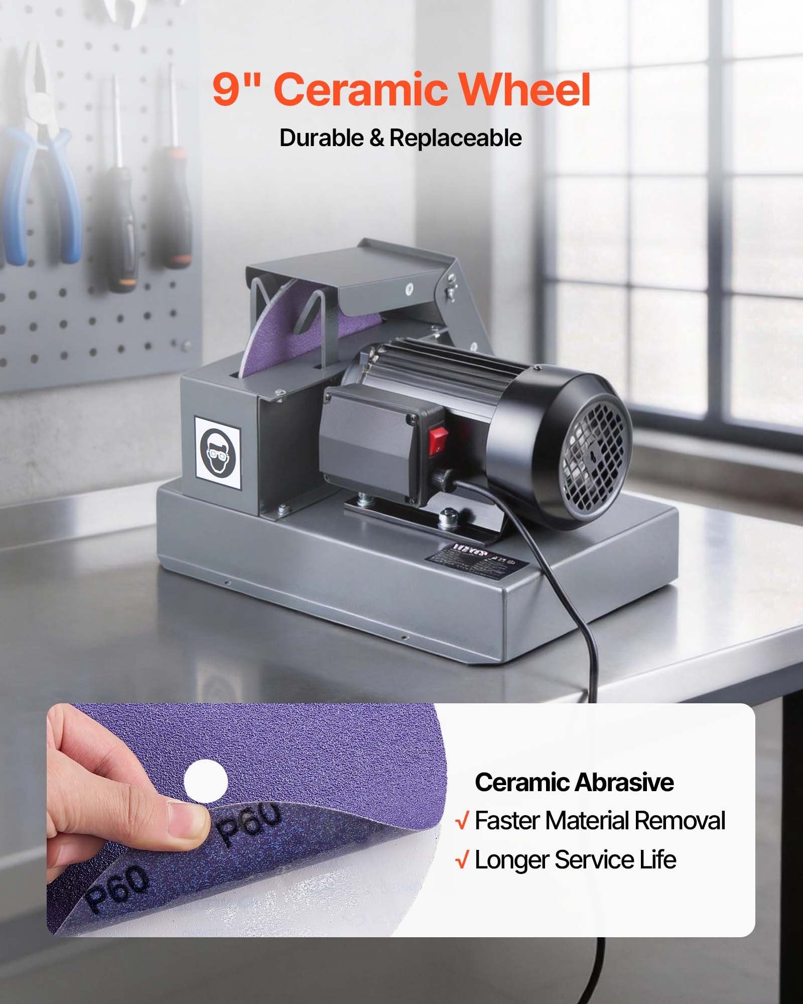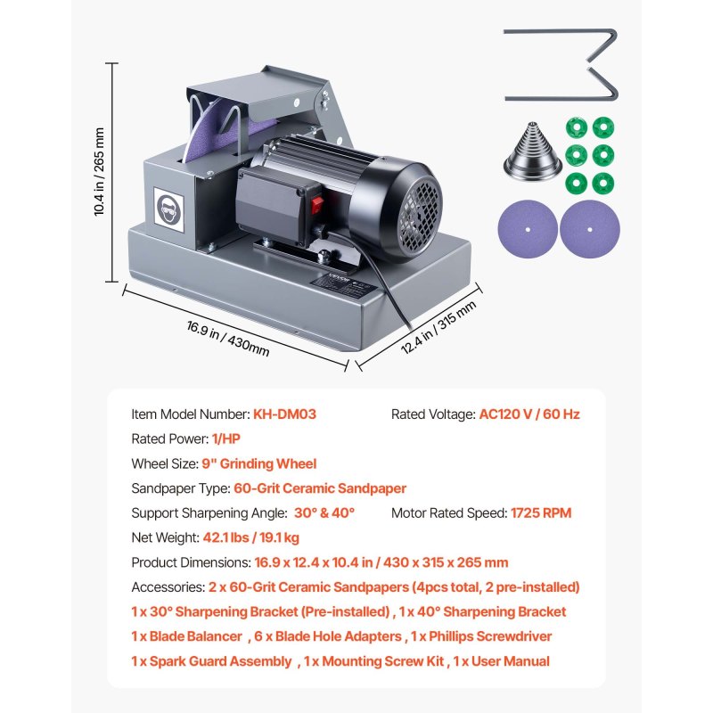 Durable Grinding Wheel: This lawnmower blade grinder features a 9" 60-grit ceramic wheel for efficient material removal, sharpening worn-out blades to a smooth finish while extending service life. Also includes 2 replacement sandpapers