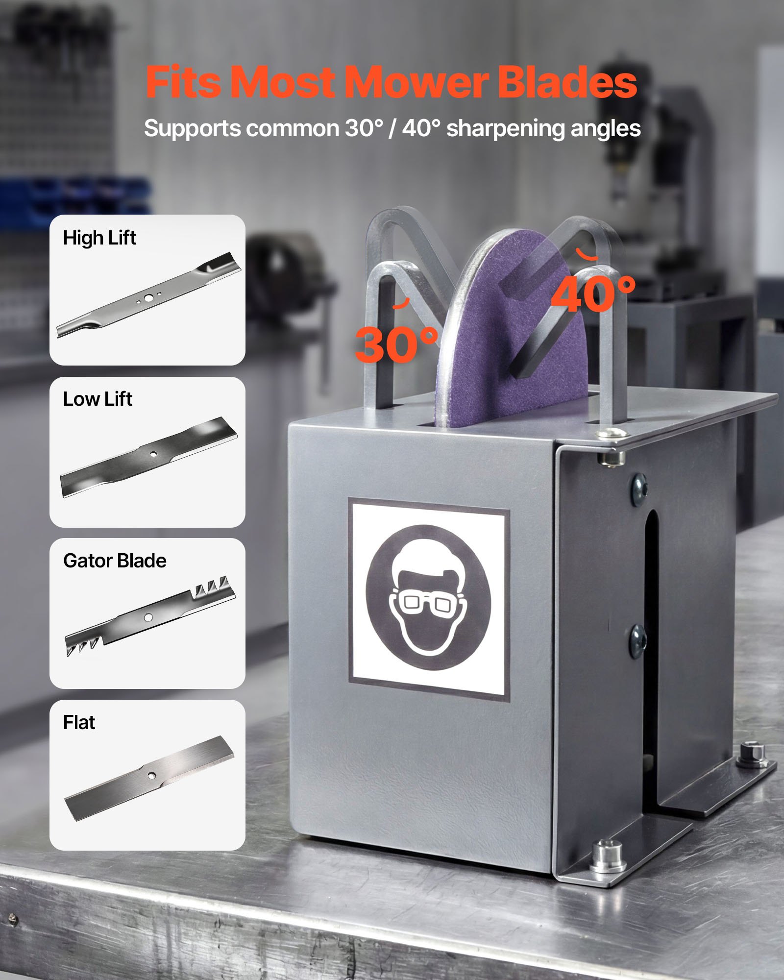 Multi-Blade Compatible: Includes one 30° fixing bracket (pre-installed) and one 40° fixing bracket, allowing precise angle control for different blade sharpening needs. Fits most mower blades, including high/low-lift, gator, and flat blades