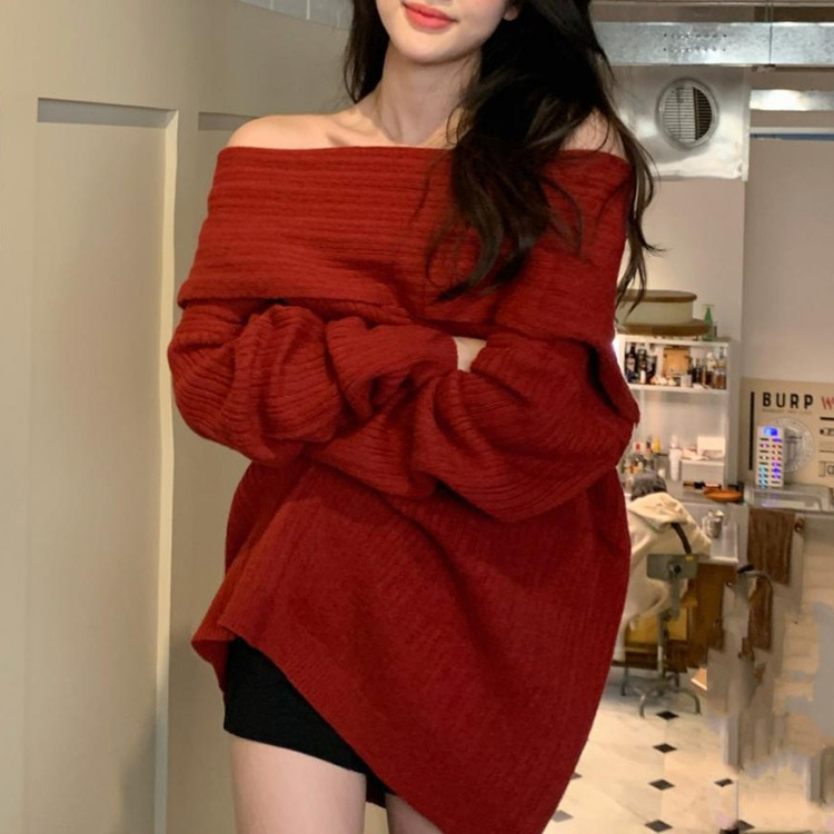 Lazy Style Shoulder-revealing Red Atmosphere Off-shoulder Sweater