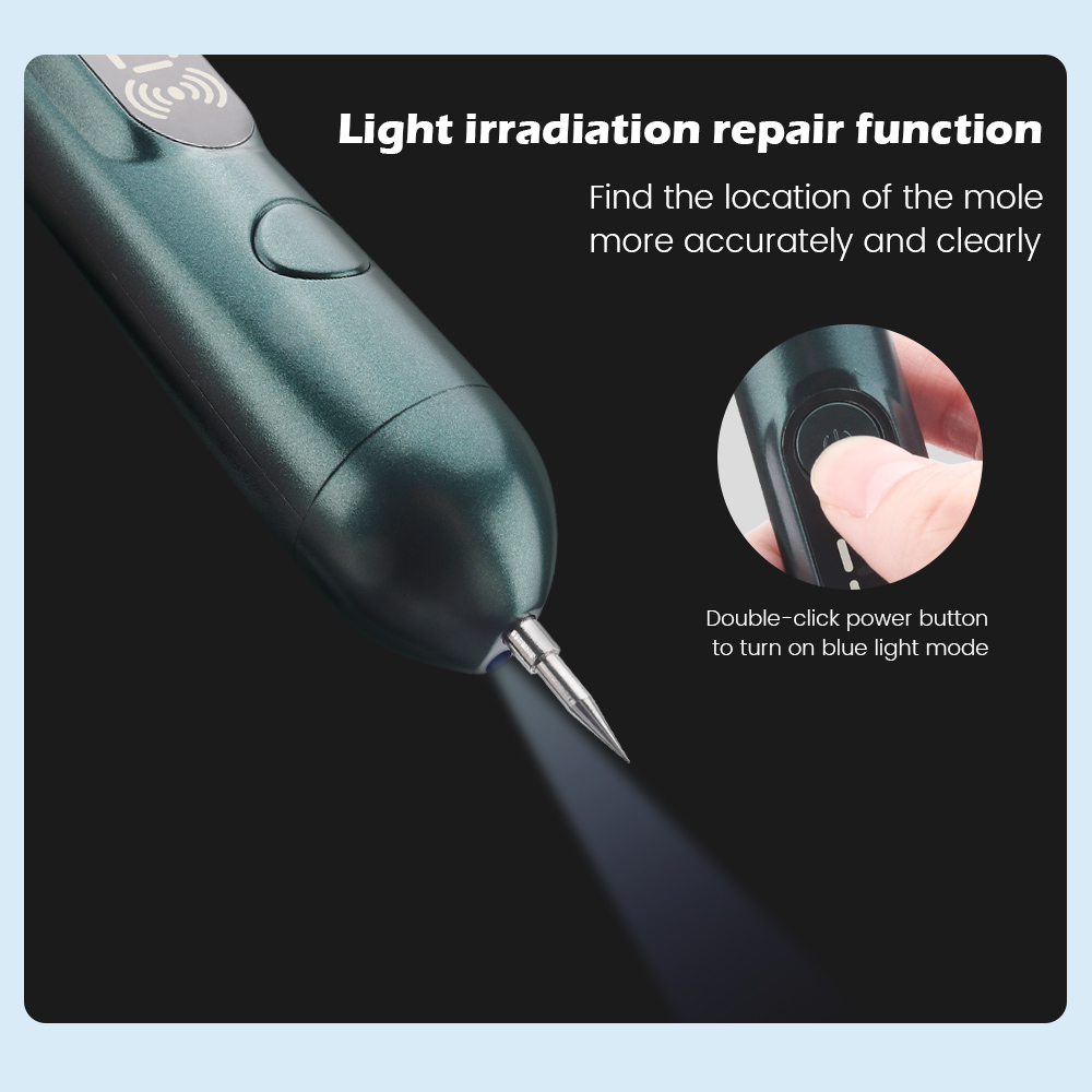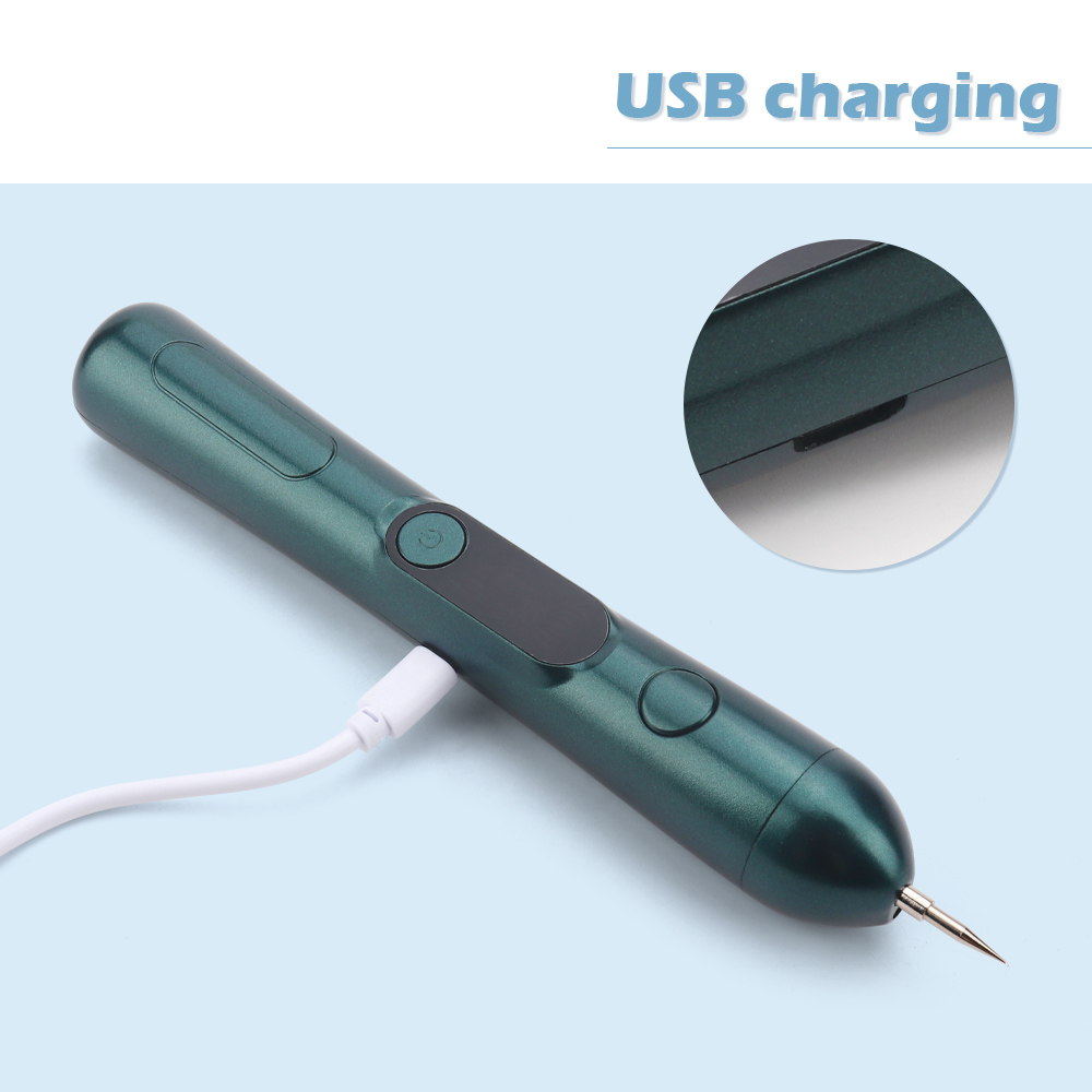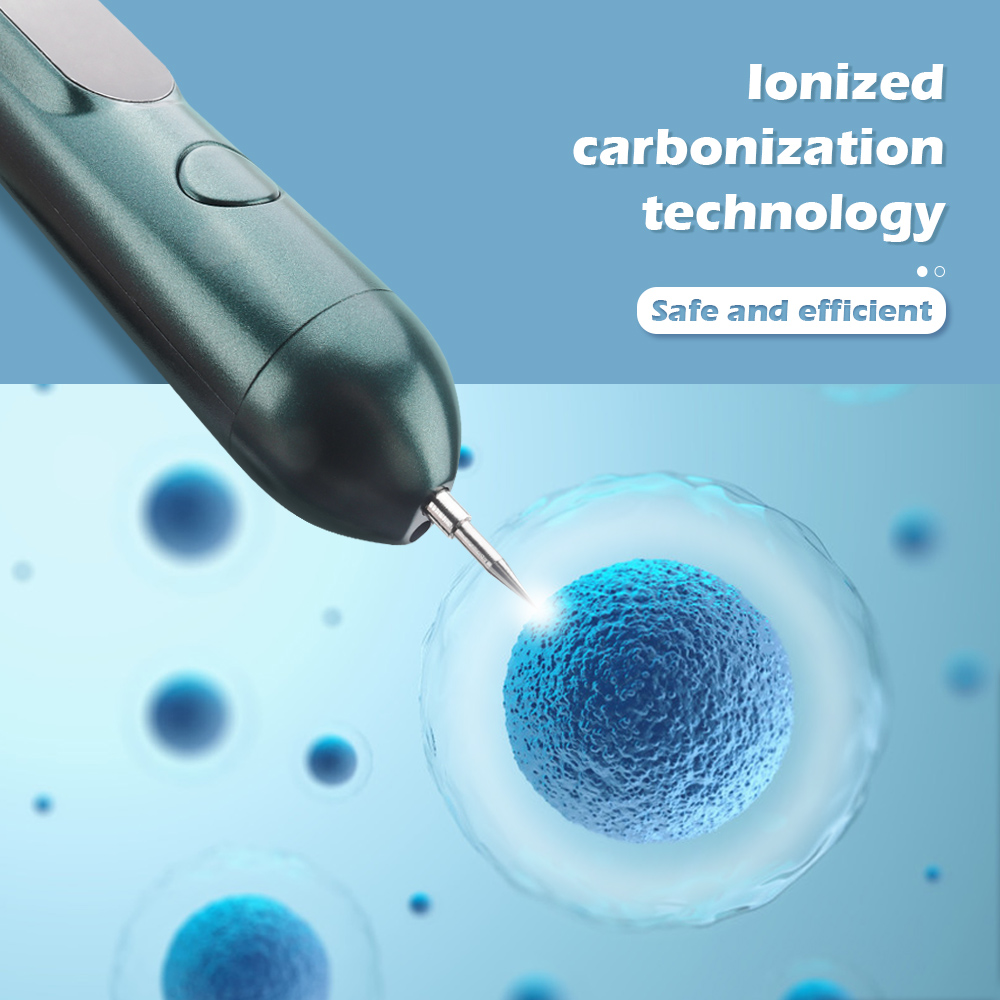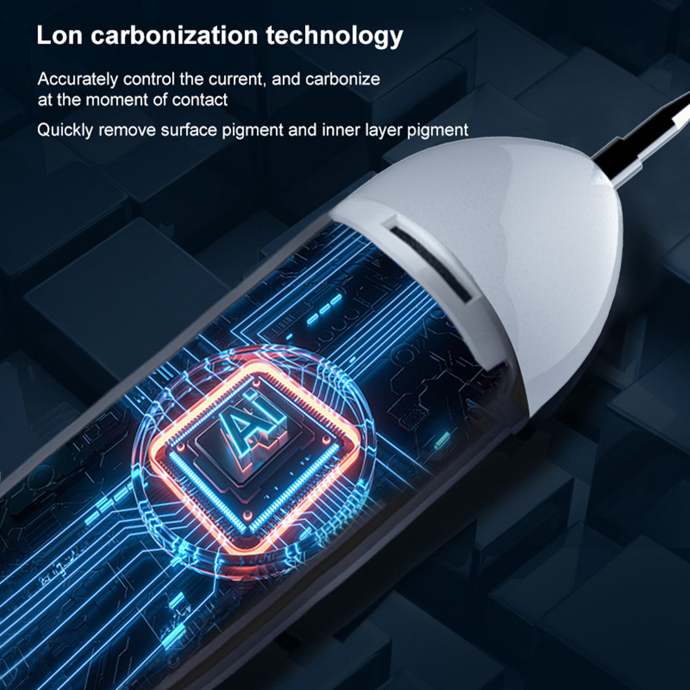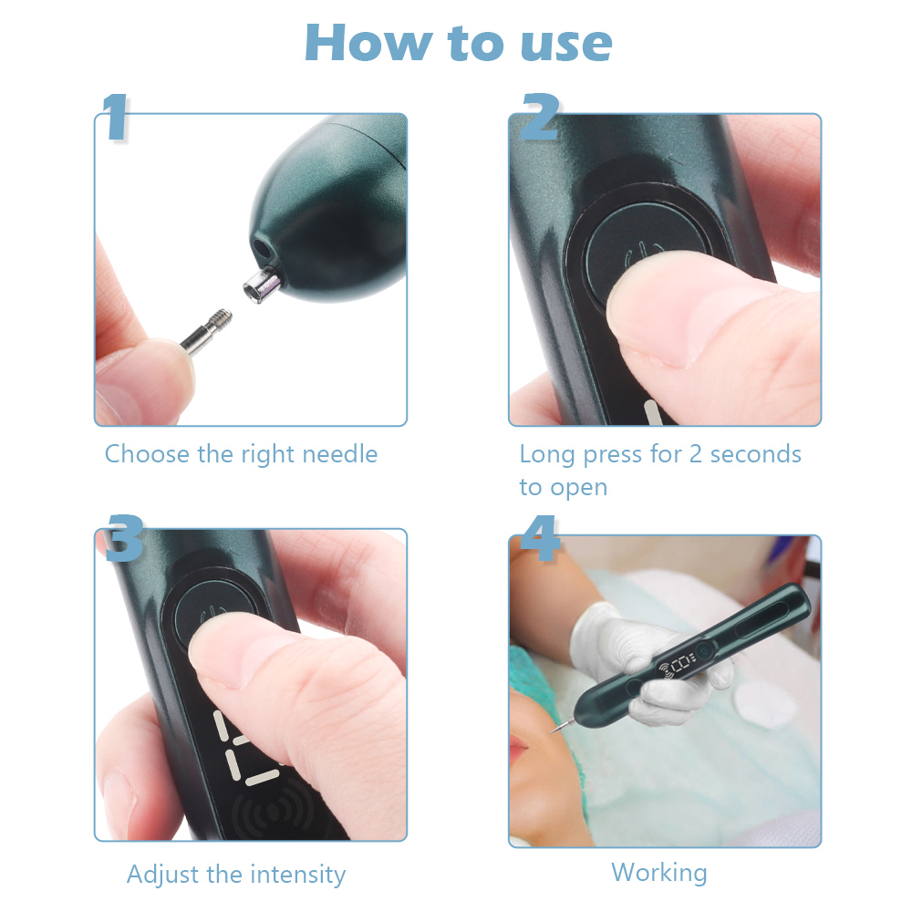 3. Select a suitable level. Gently apply to the skin. Do not operate with force. Keep your hand still, and gently move the tip of the pen back and forth or in a circular motion. When the needle tip touches the skin, you will see the electric spark and feel a slight tingling. Then the treated part will be burnt and charred and the skin around the treated part will raise slightly.