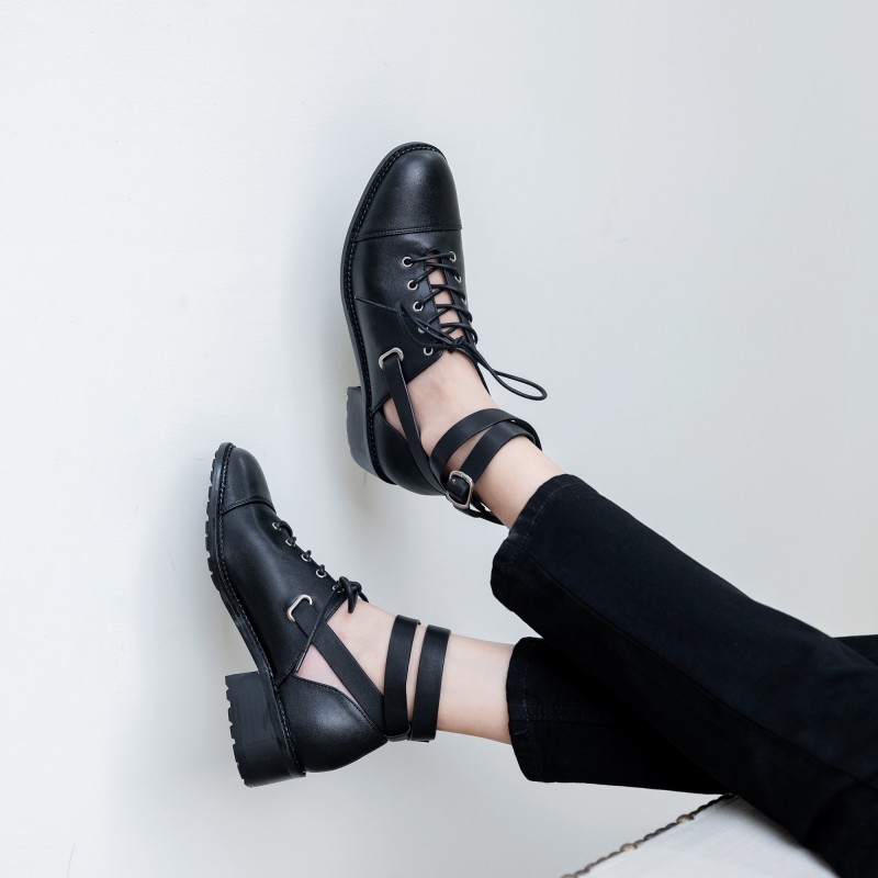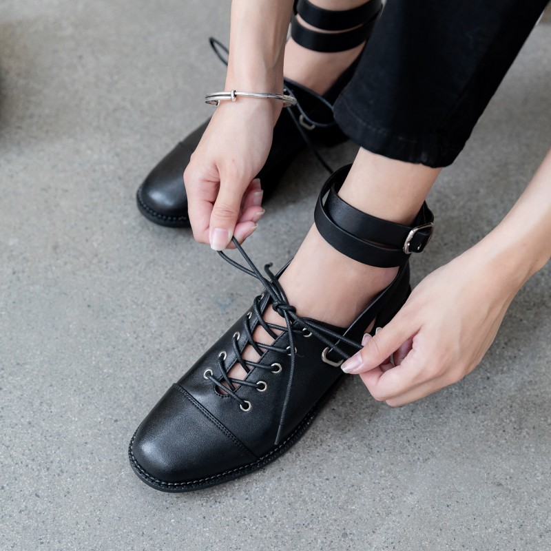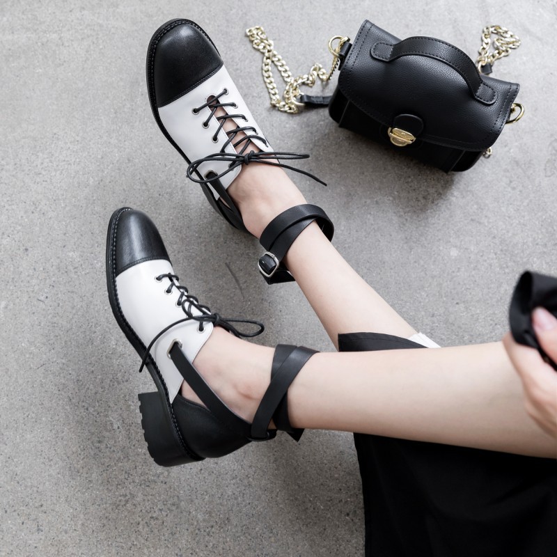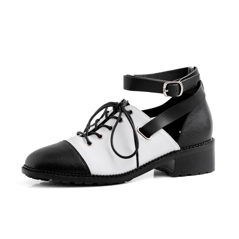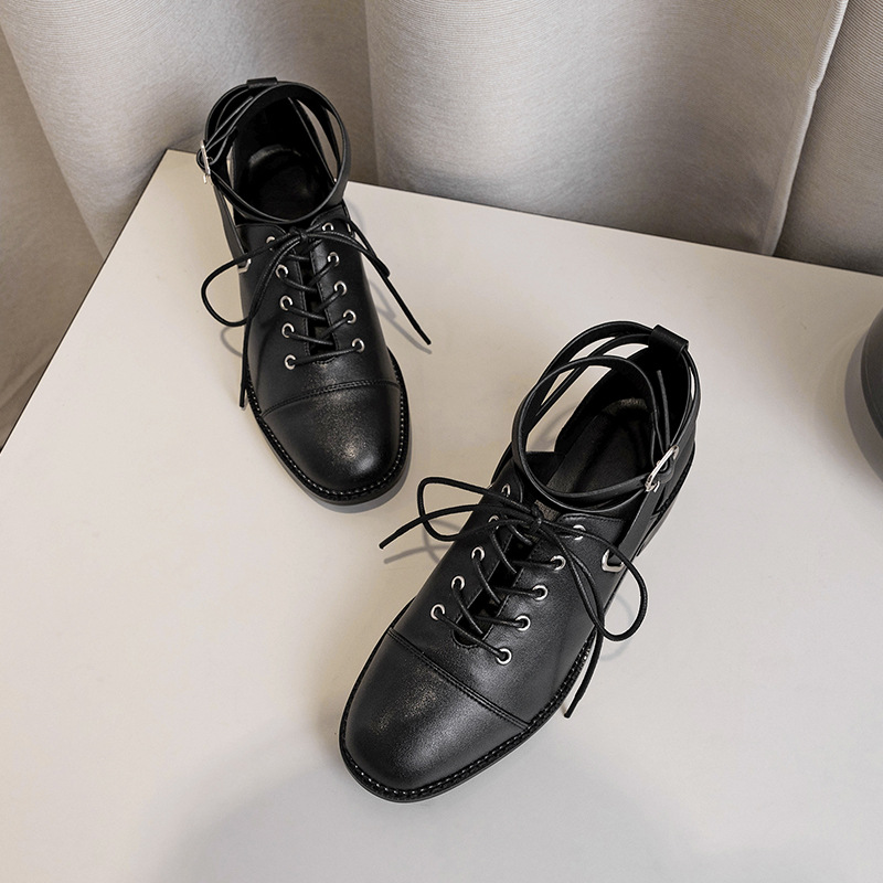 Leather Square Heel Round Toe Front Lace-Up Leather Buckle Small Leather Shoes