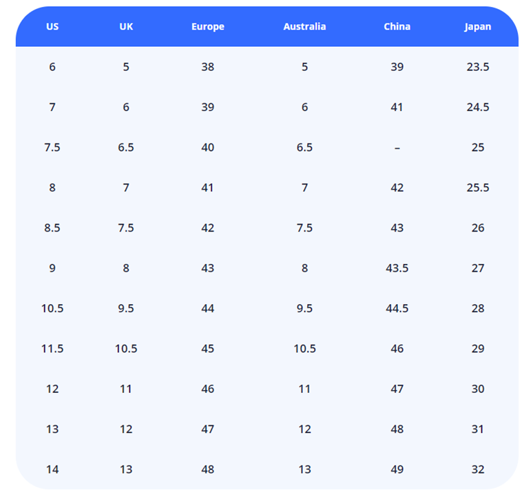 Sizes: 33, 34, 35, 36, 37, 38, 39, 40, 41, 42, 43, 44, 45