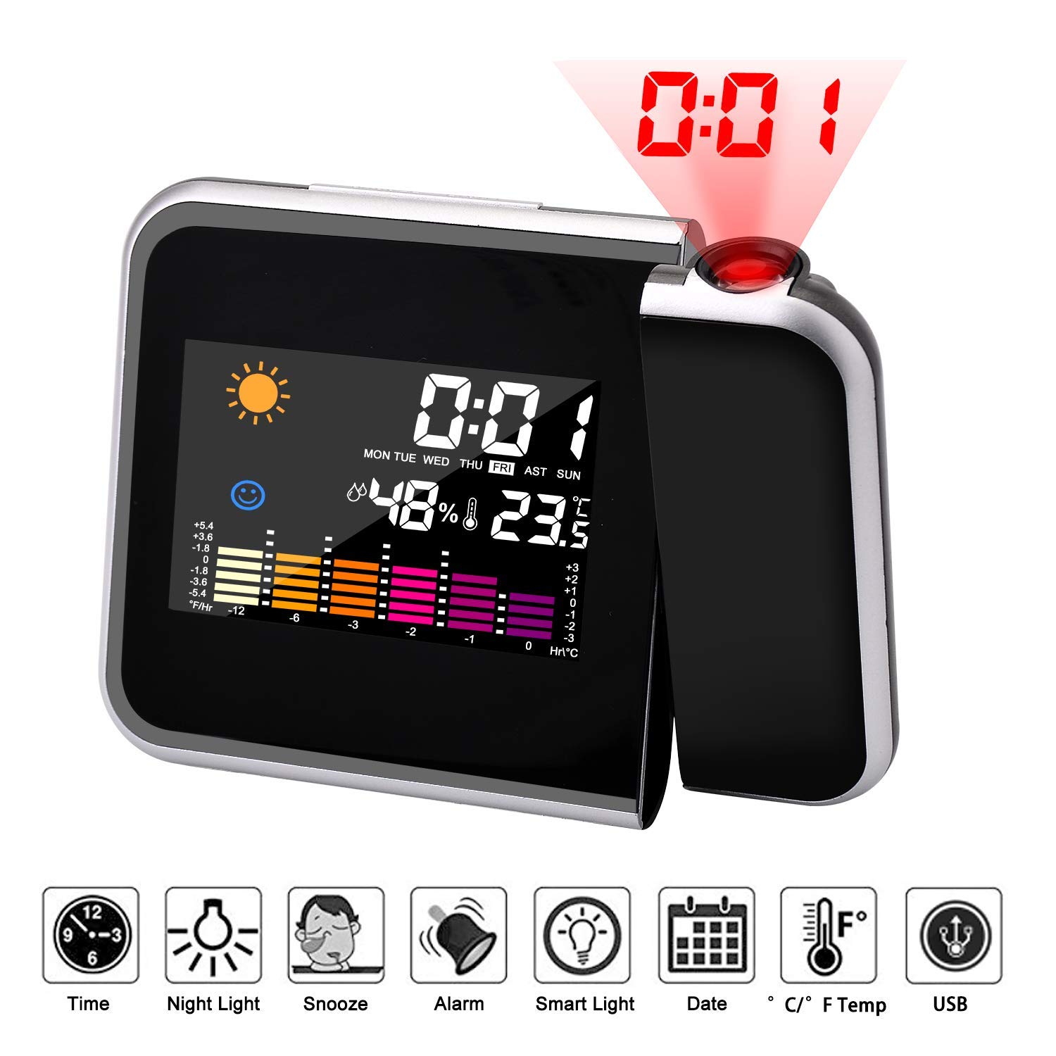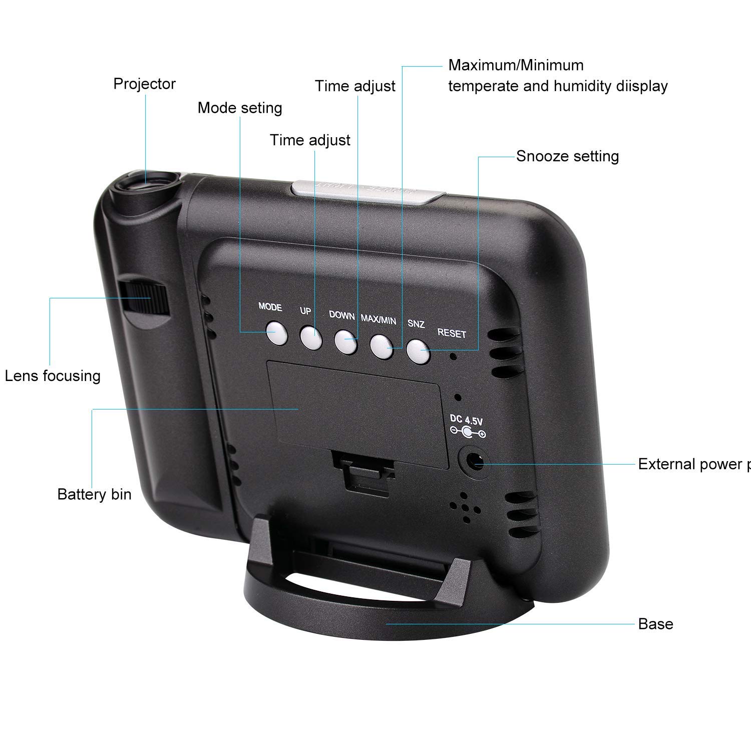 2. Alarm clock function: This projection alarm clock has a snooze setting, and the alarm sound is soft, allowing you to wake up on time.
