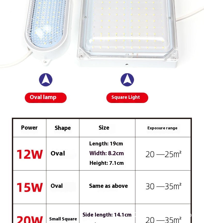 Light source power: Oval 12W, Oval 15W, oval 20W, square 30W, square 40W, 60W