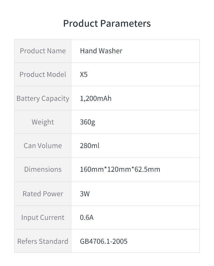 Specifications:Size: 160mm*120mm*62.5mmLiquid capacity: 280mlWeight: 360gbattery capacity: 1200mAhPackage Content: 1 x Foaming Hand Washer
