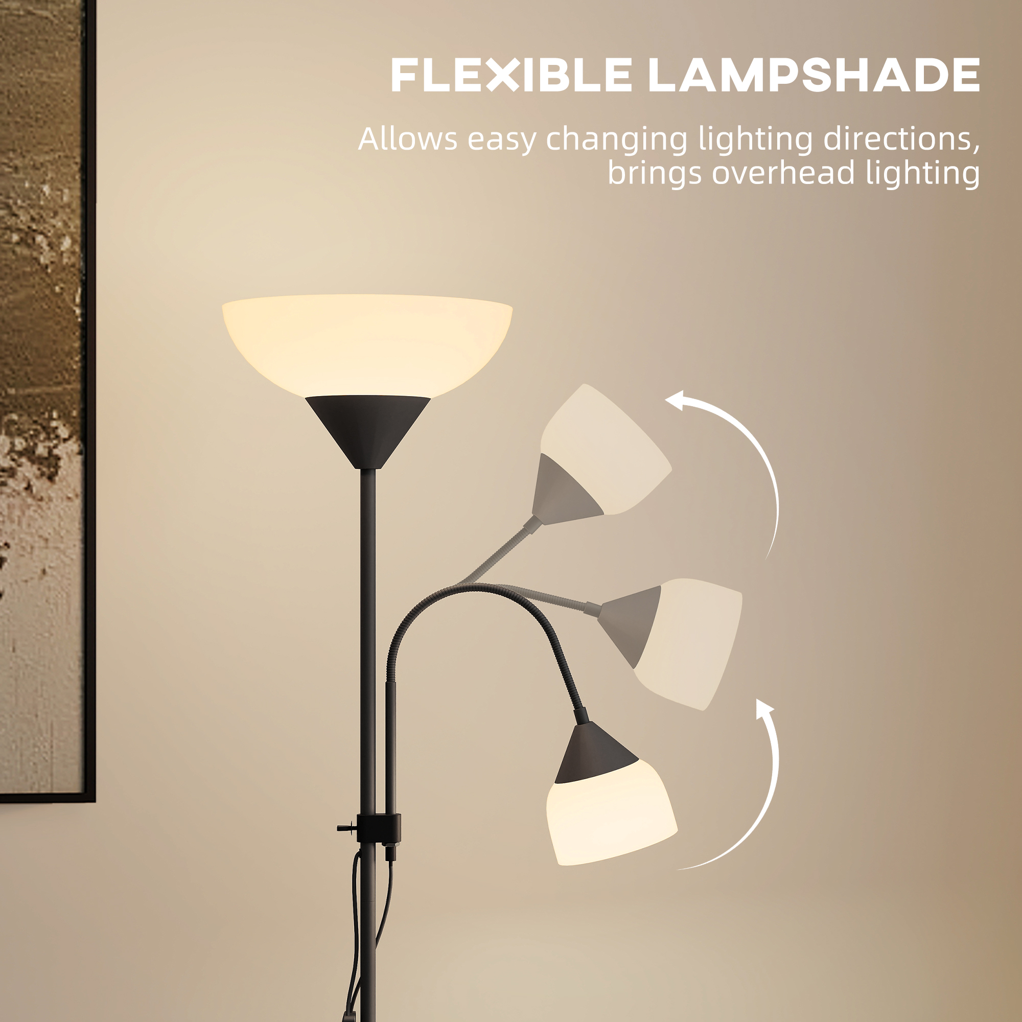 Bring double the elegance to your home with this mother-and-child floor lamp. It features two lights: a top uplighter and a flexible mid-arm reading lightptimal for evenings (bulbs not included). The robust metal frame offers durability, while cone shades protect from accidental contact with hot bulbs. Two separate switches let you control each light independently.