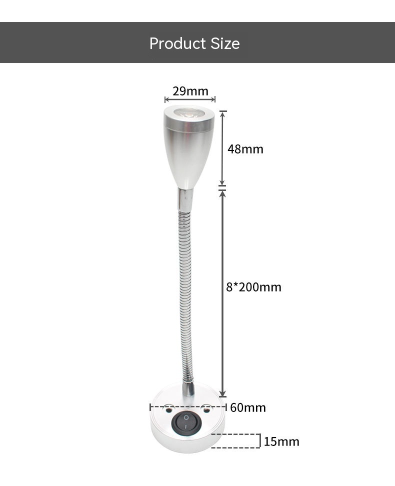 Size: Hose total length 8 * 200mm lamp holder 29 * 48mm base: diameter 60mm height 15mm