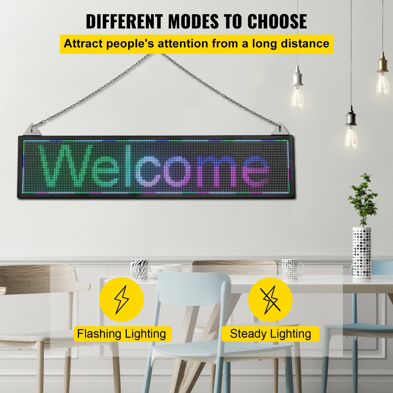 Multiple Lighting Modes: The LED scrolling message board has two lighting modes: steady lighting and flashing lighting. The steady mode saves energy during the day, and the flashing mode attracts people’s attention from a long distance at night.