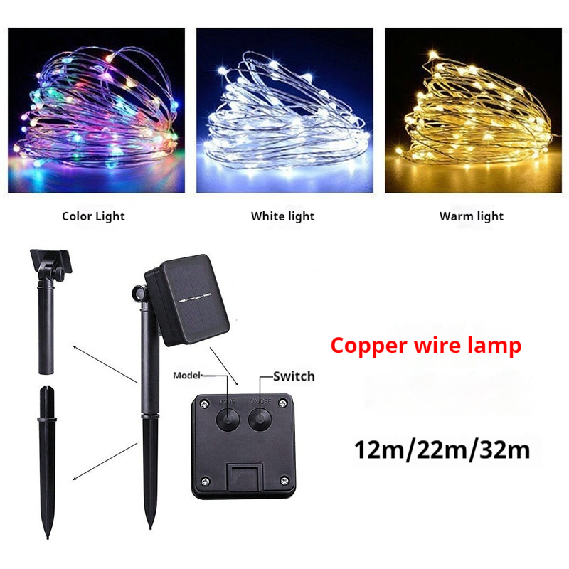 Power: 7 meters 50 lights, 12 meters 100 lights, 22 meters 200 lights, 32 meters 300 lights, solar copper wire lights 42 meters 400 lights