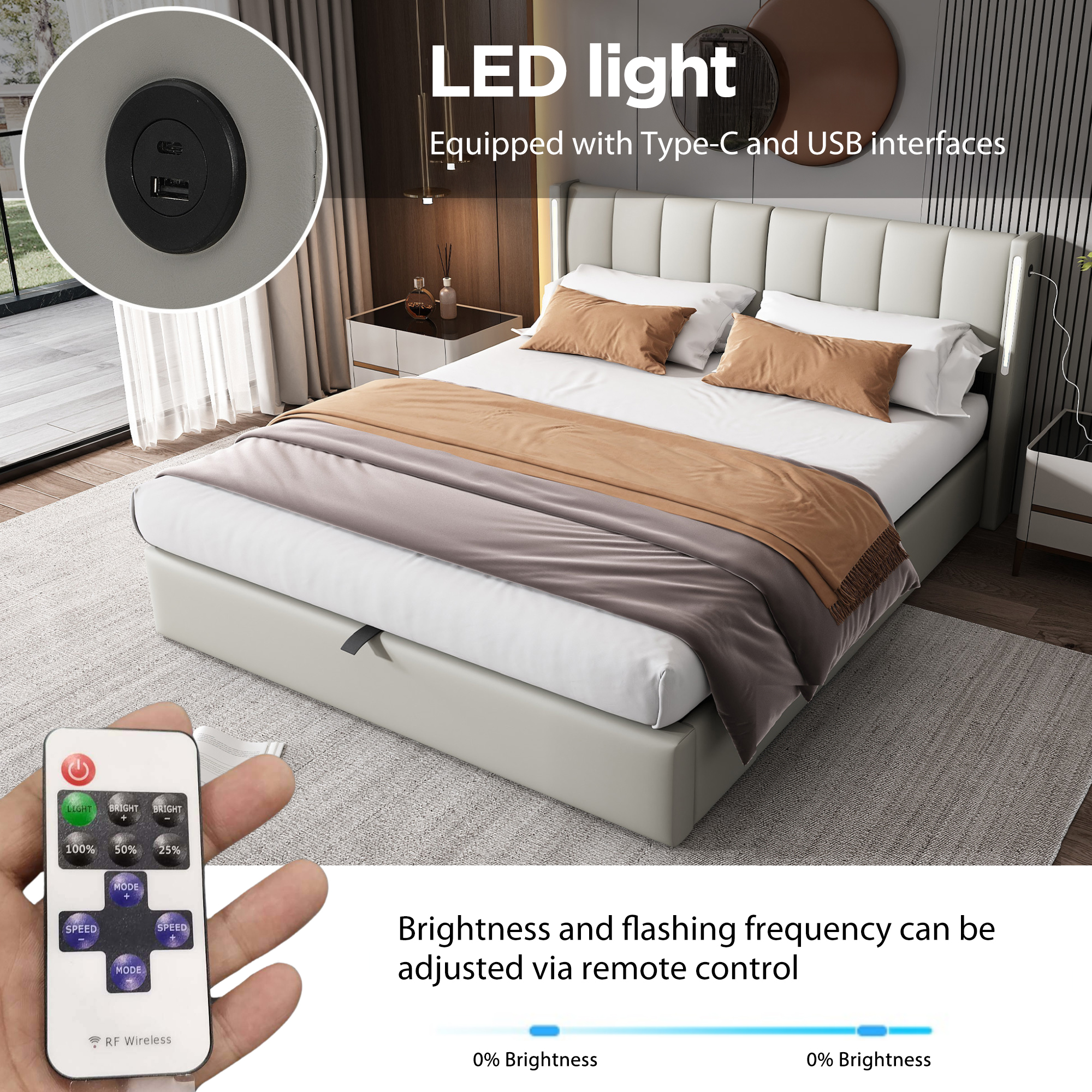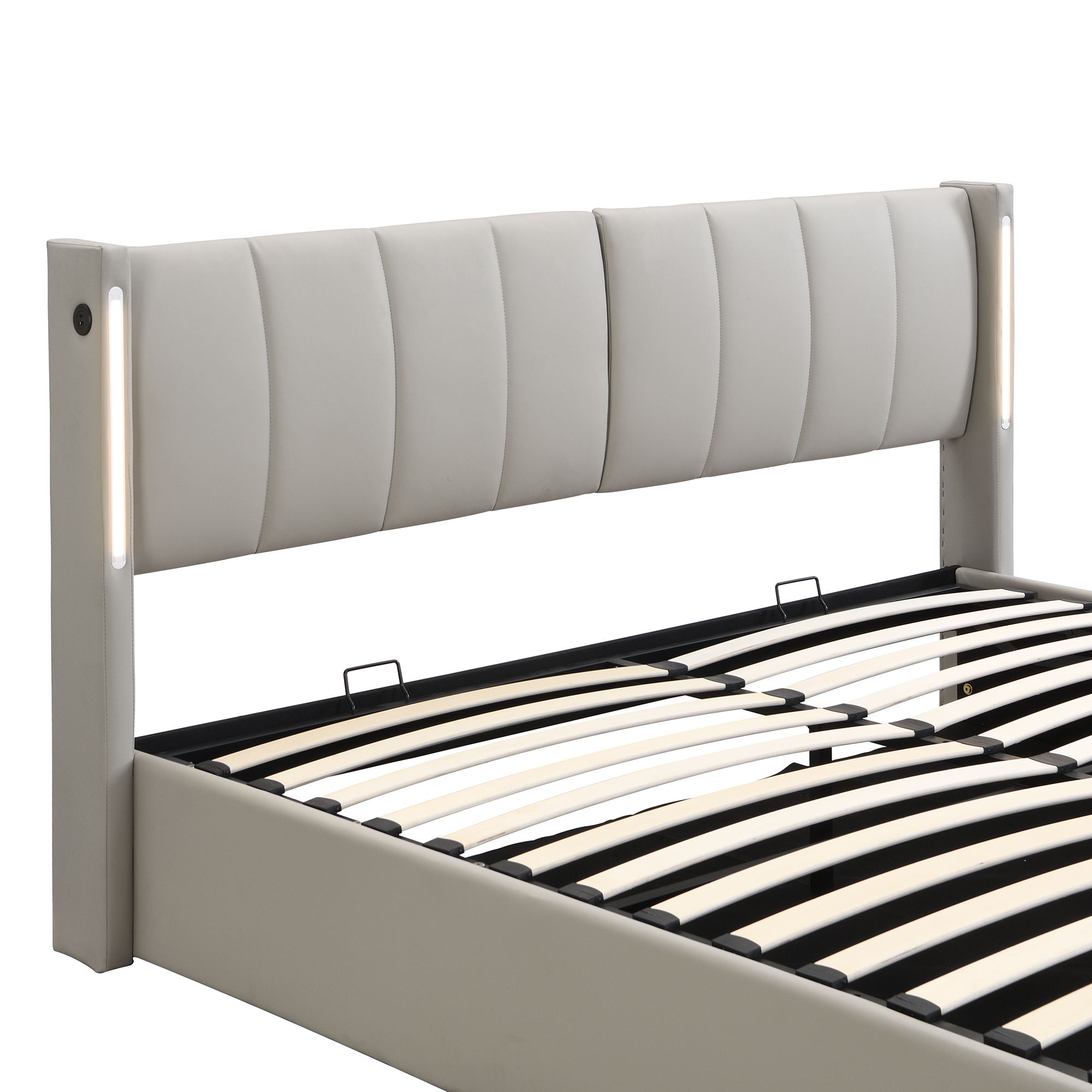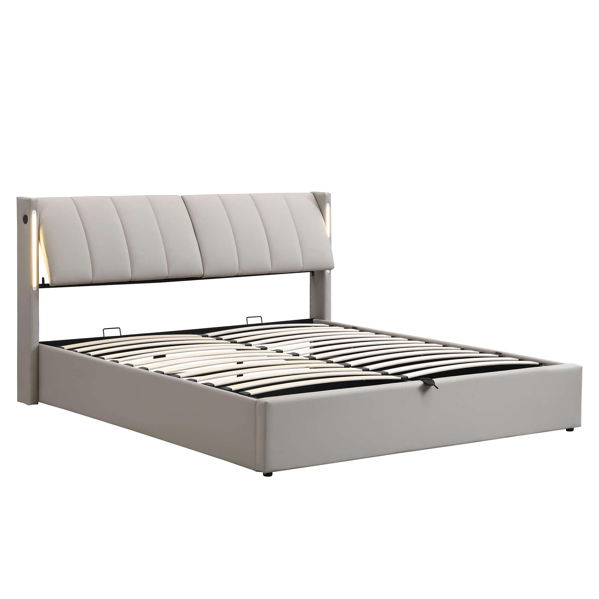 Product Name:LED upholstered bed ,King Size Bed-5ft(150*200cm), hydraulic bed, rechargeable USB port in bed, with LED lighting, with storage space, adjustable headboard, PU , grey