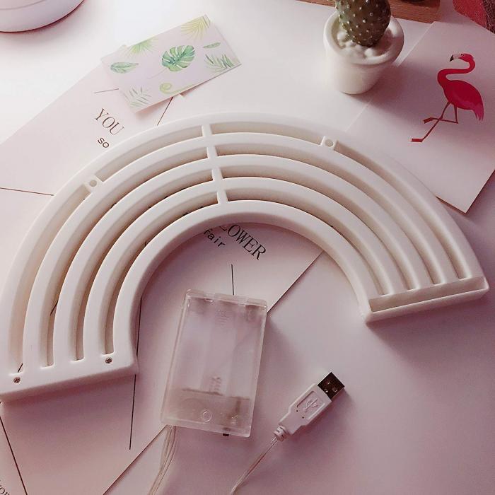 The beautiful neon rainbow night light is a great solution for decorating children. Beautiful and modern decorative LED lights. This LED light trim adds some excitement to this bedside table.
