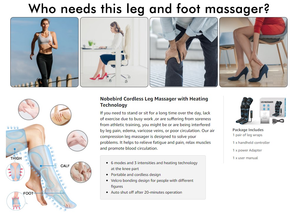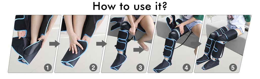 Technical ParameterPower Specification: 5V 2A Output Voltage: 3.7V 2.5A Product Power: 10W Automatic Shutdown Time: 20min Noise Level: 57dB for low mode; 60dB for the high mode 6 Modes: Auto, Leg, Foot, Press, Pinch, Relax Massage Intensity: Foot 30kpa, 36kpa, 38kpa; Calf: 22kpa, 24kpa, 30kpa; Thigh: 22kpa, 24kpa, 30kpa Knee temperature: 35℃, 45℃, 55℃, (default low-temperature 35℃) Leg Circumference Size: Maximum foot circumference: 36cm Maximum calf circumference: 55.5CM Maximum thigh circumference: 75.5cm Recommended Use: 10min is recommended for each mode, and each mode is used once a day