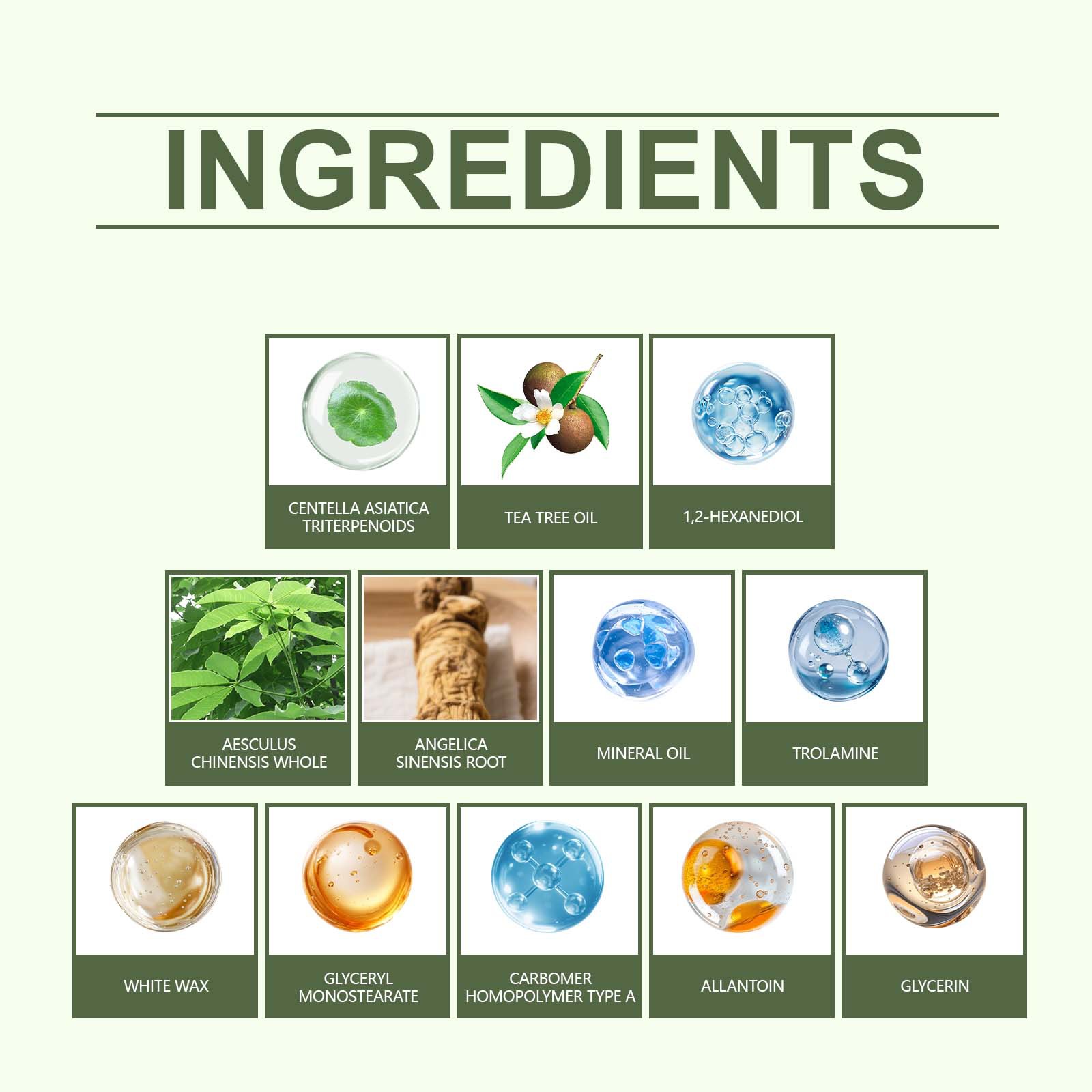 Active ingredients: Aesculus chinensis, Radix Angelicae Sinensis, tea tree oil and Centella asiatica.