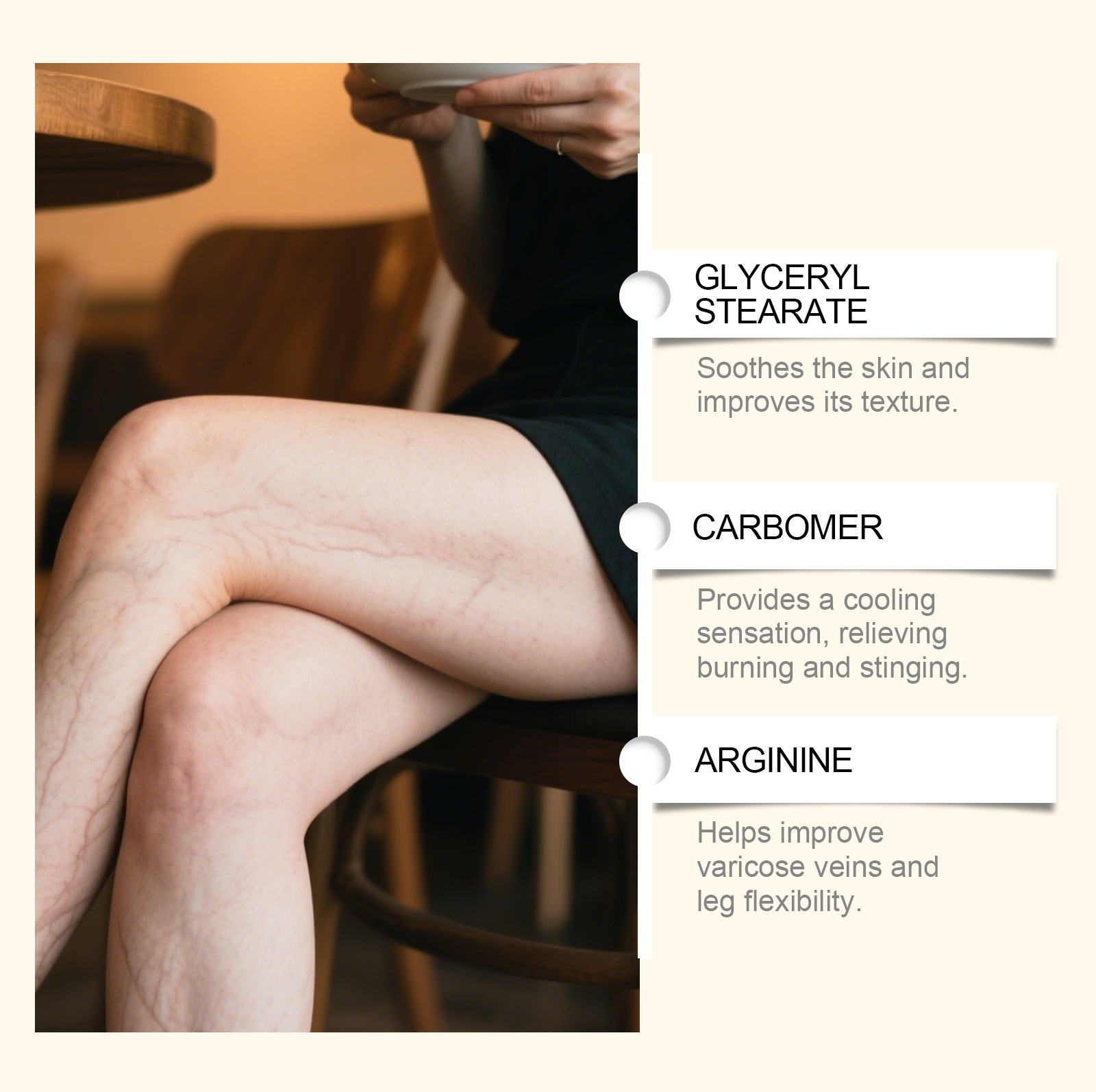 Inactive ingredients: water, mineral oil, glycerol, glyceryl stearate, 1,2- hexanediol, carbomer and arginine.
