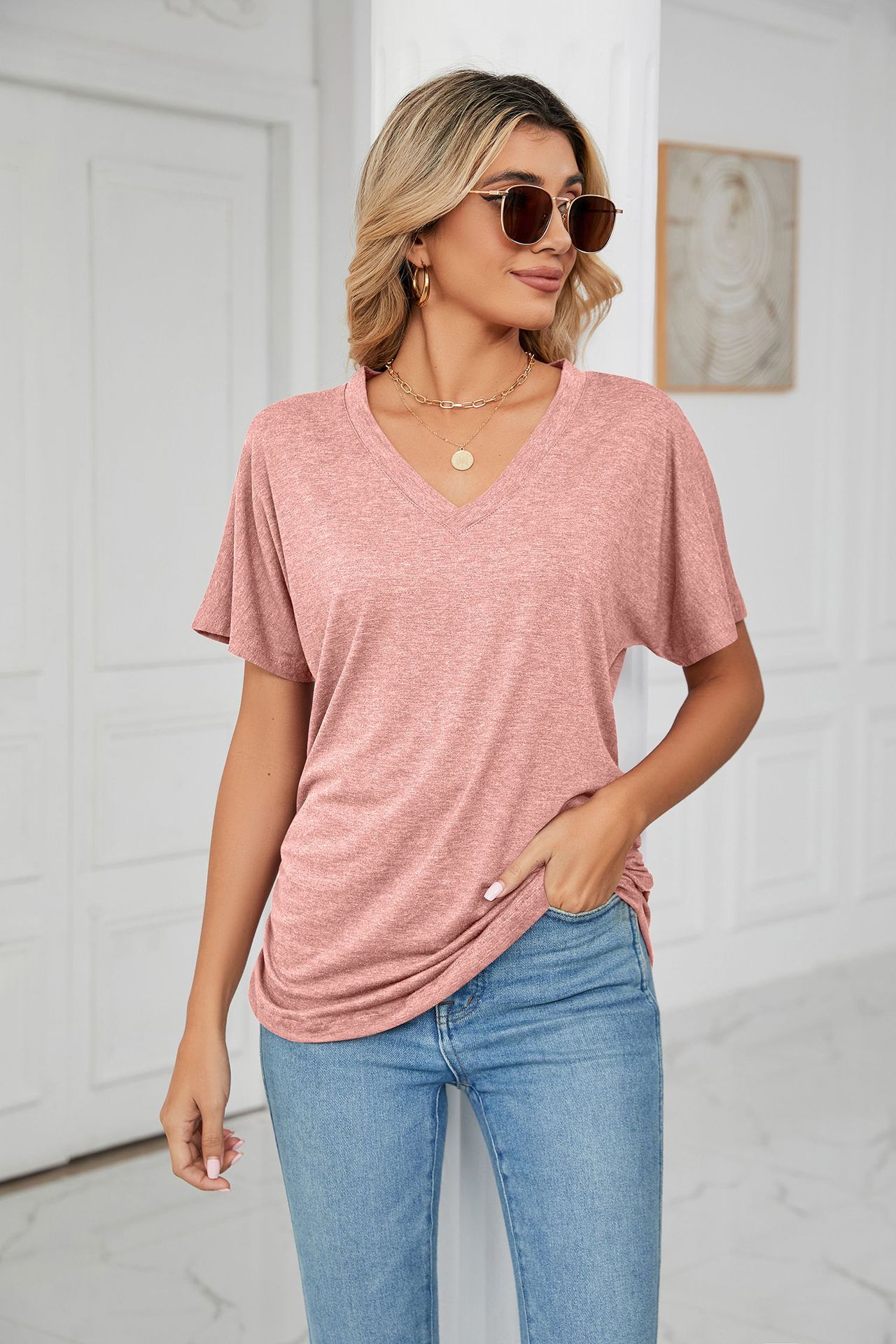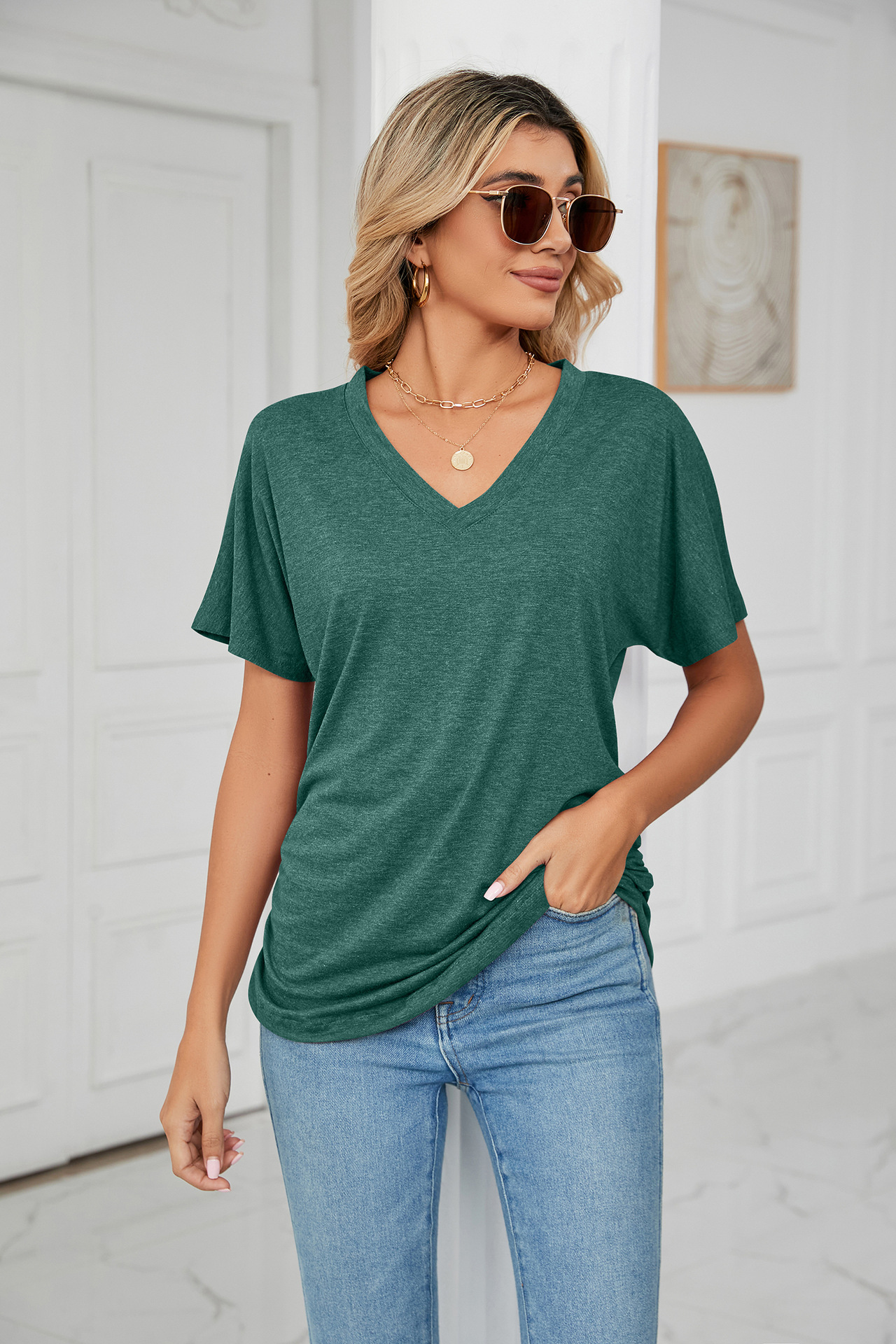 Leisure Pullover V-neck Solid Color Loose T-shirt Women's Top