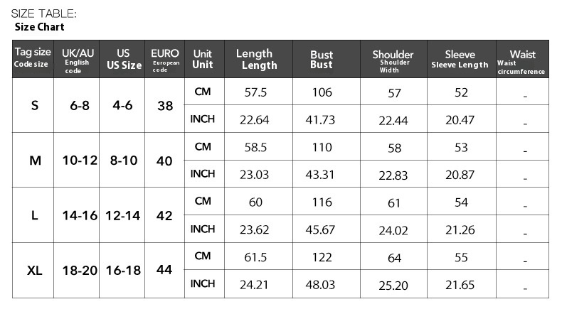 Note: 1. Asian sizes are 1 to 2 sizes smaller than European and American people. Choose the larger size if your size between two sizes. Please allow 2-3cm differences due to manual measurement. 2. Please check the size chart carefully before you buy the item, if you don't know how to choose size, please contact our customer service. 3.As you know, the different computers display colors differently, the color of the actual item may vary slightly from the following images.