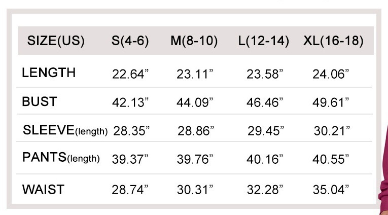 | Size | Length | Bust | Sleeve | Pants Length | Waist |