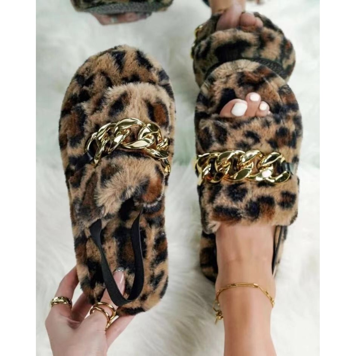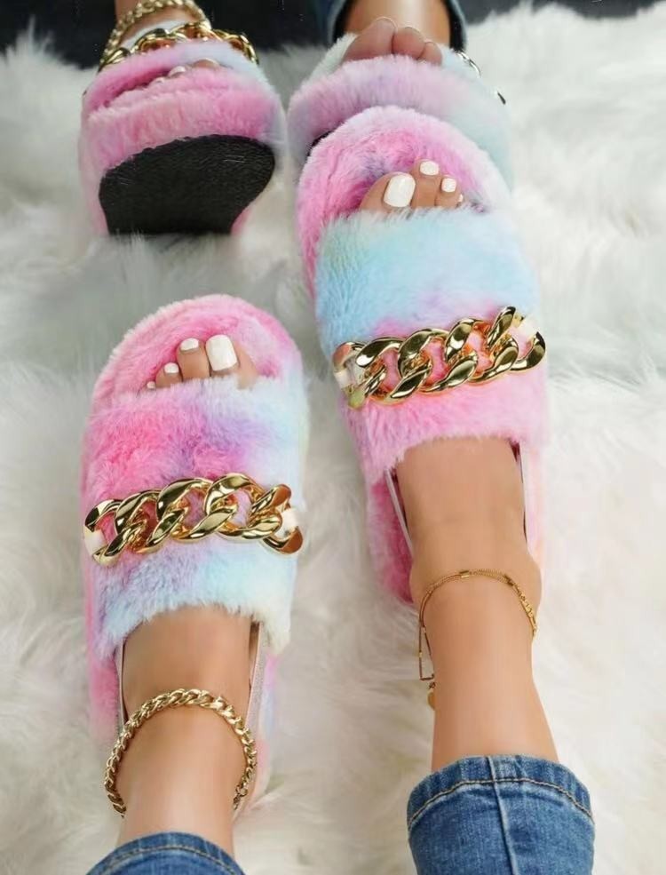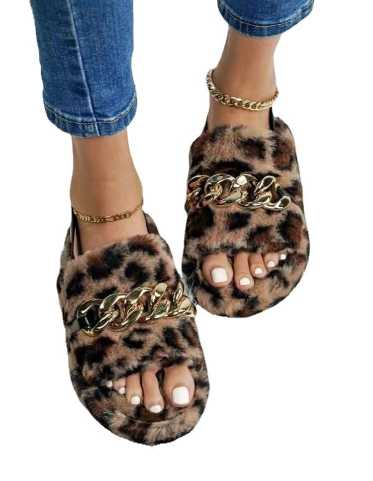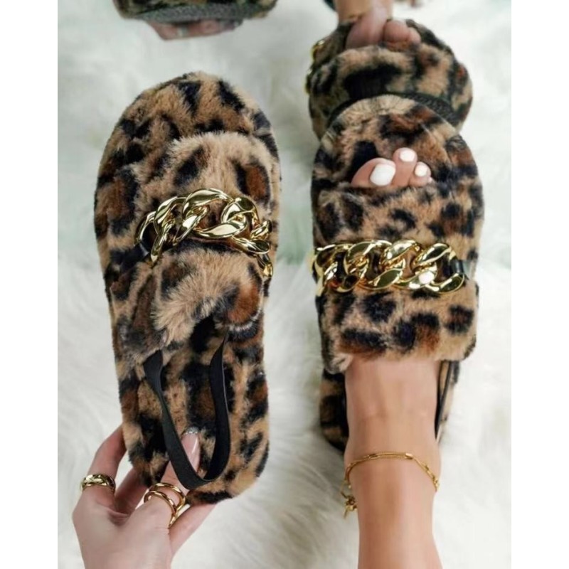 Leopard Print Casual Ethnic Style Flat Metal Chain Leopard Print Plush Slippers