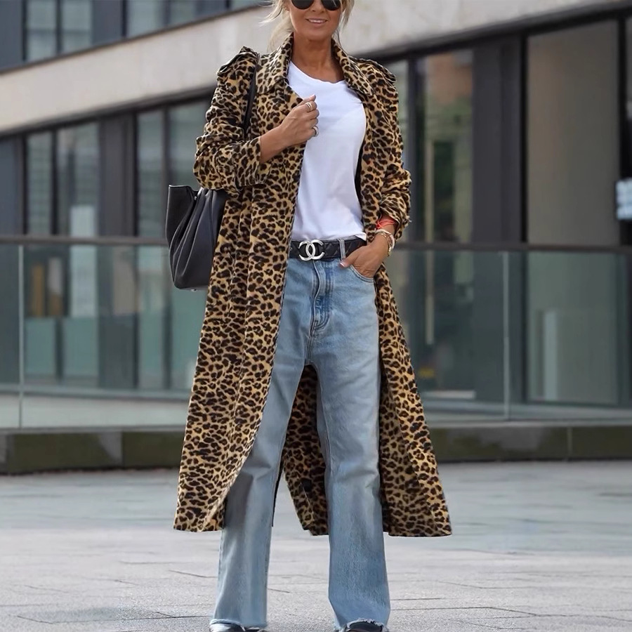 Leopard Print Women's Ultra-long Slim-fit Large Lapel Coat