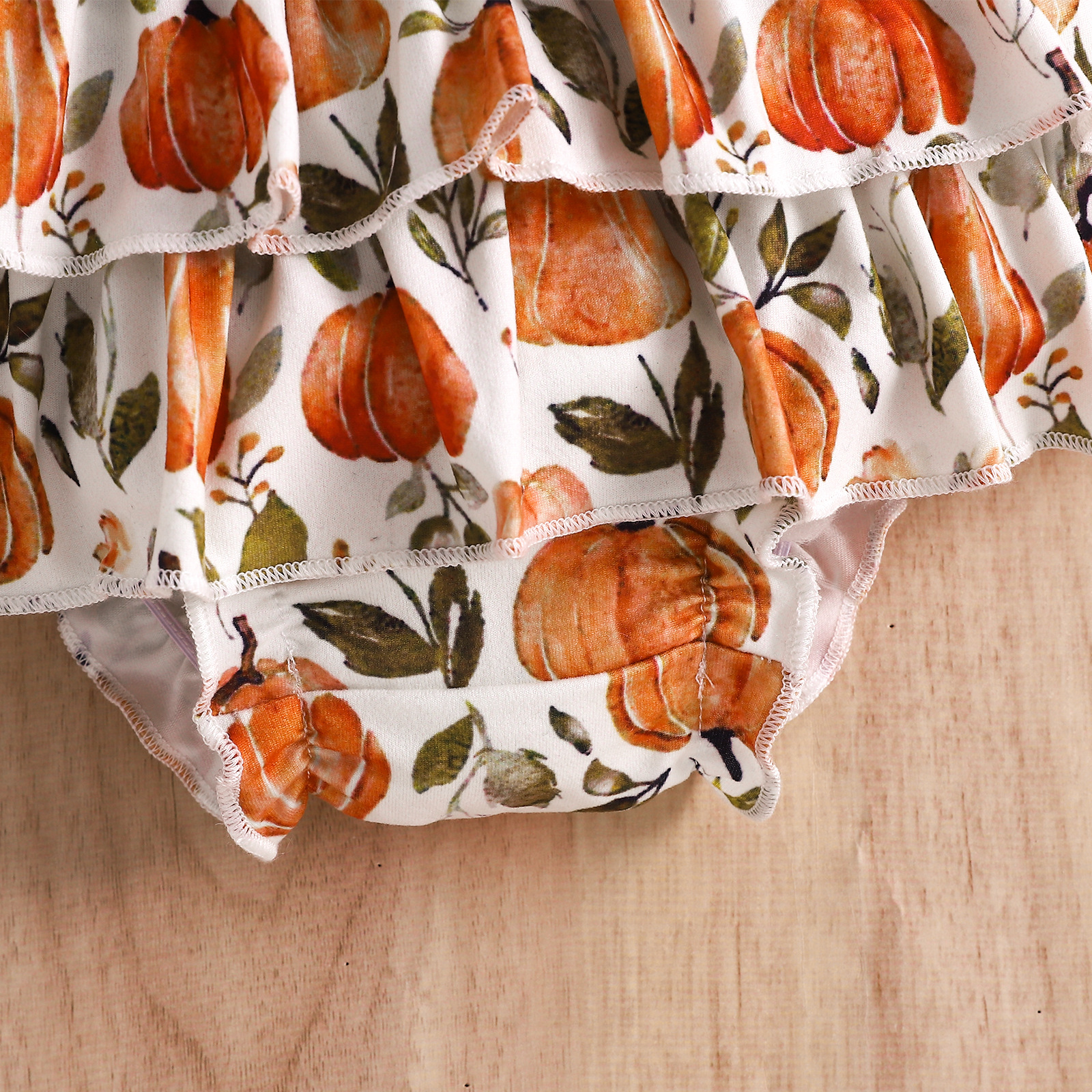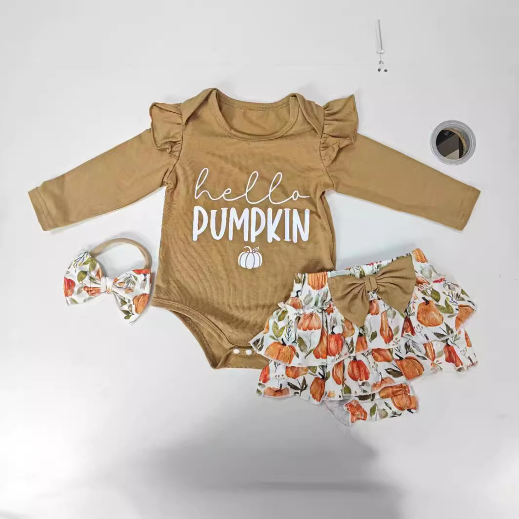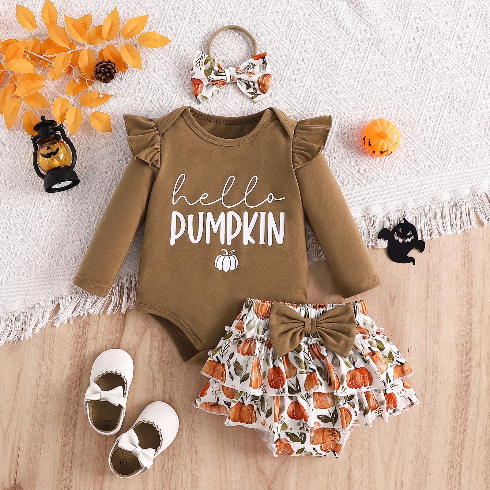 Letter Romper Pumpkin Print Shorts Hair Band Three-piece Set